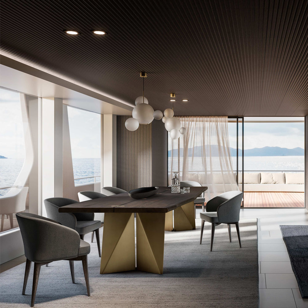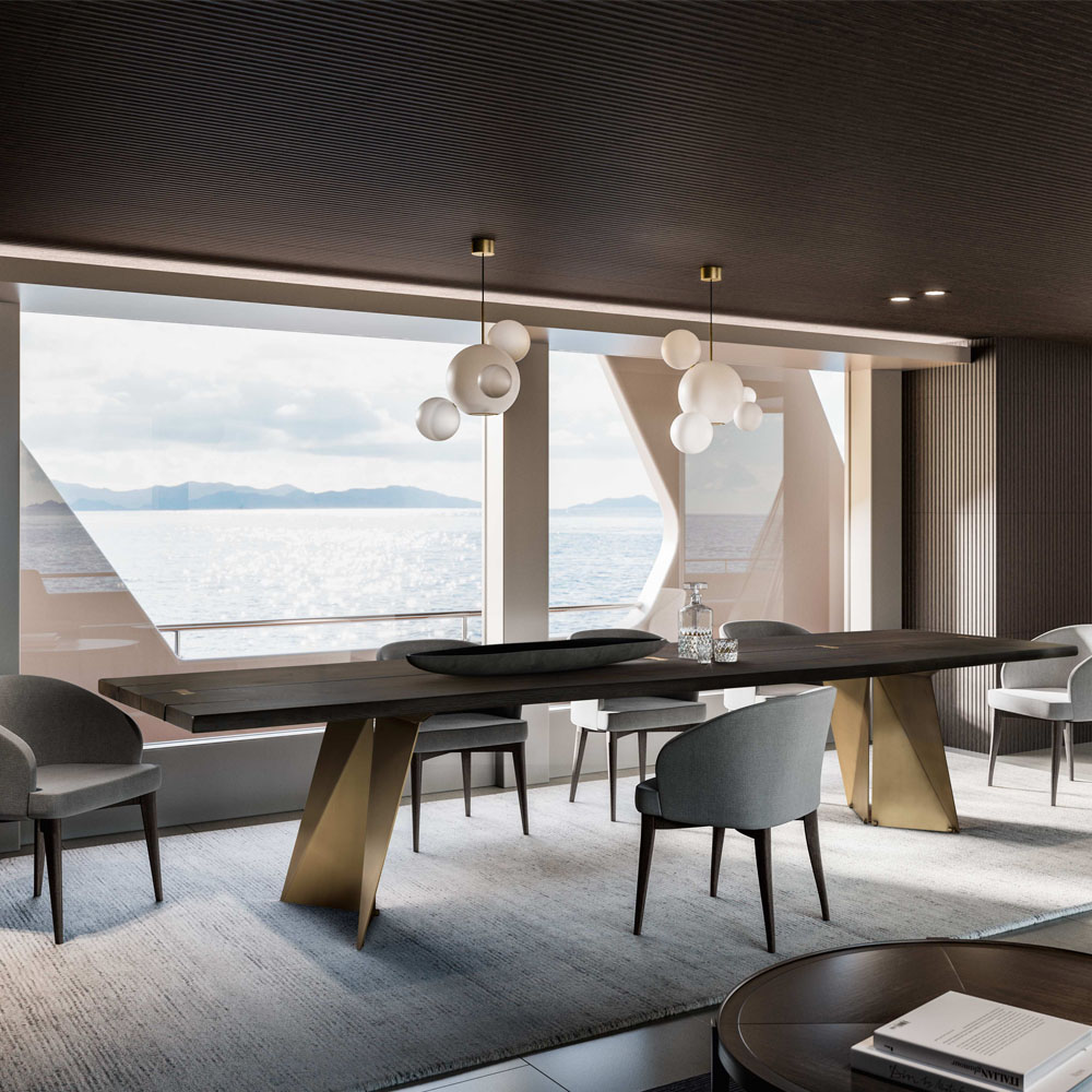 Μοναδικό στο είδος του, το τραπέζι Vela γεννήθηκε από την ιδέα της δημιουργίας επιβλητικών παιχνιδιών φωτός μέσα από μια σύνθεση πρισμάτων. Κατασκευάζεται σε διαφορετικές διαστάσεις, φινιρίσματα και μέταλλα κατόπι επικοινωνίας.