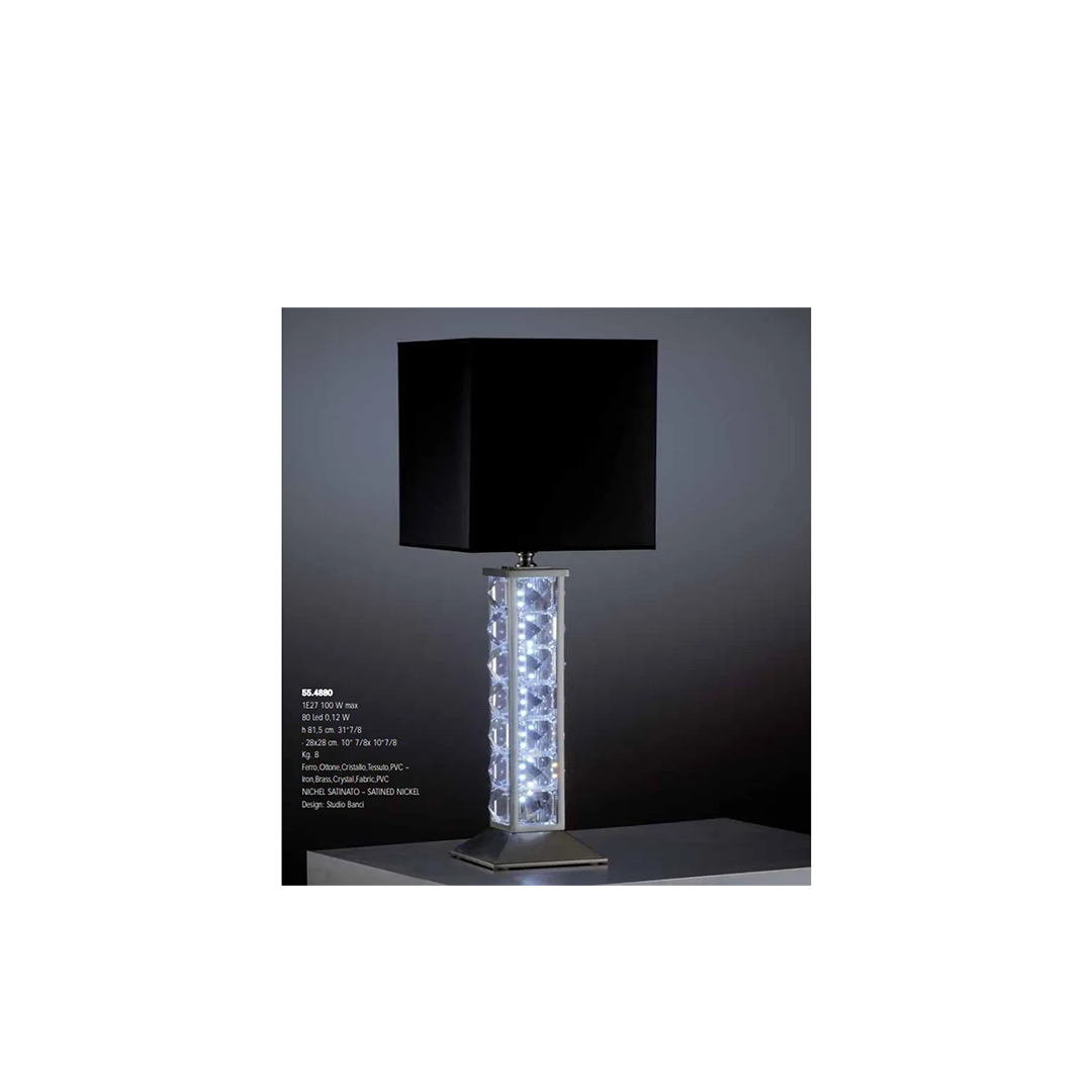 Επιτραπέζιο φωτιστικό, ιταλικής προέλευσης, από σίδερο, ορείχαλκο, κρύσταλλο, ύφασμα & PVC , σε φινίρισμα σατινέ νικέλιο.
