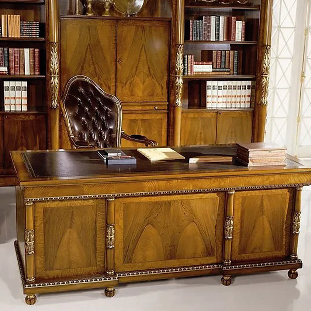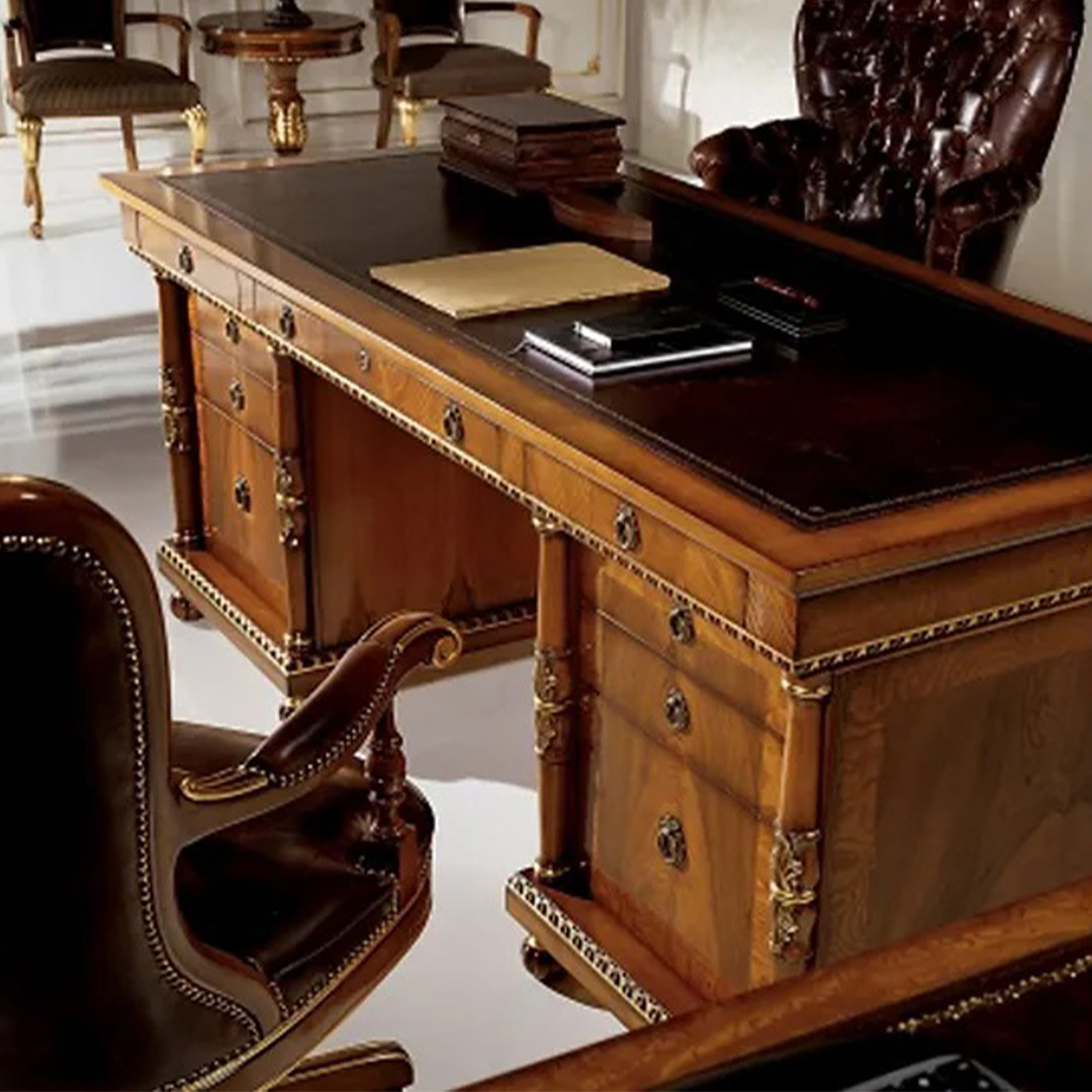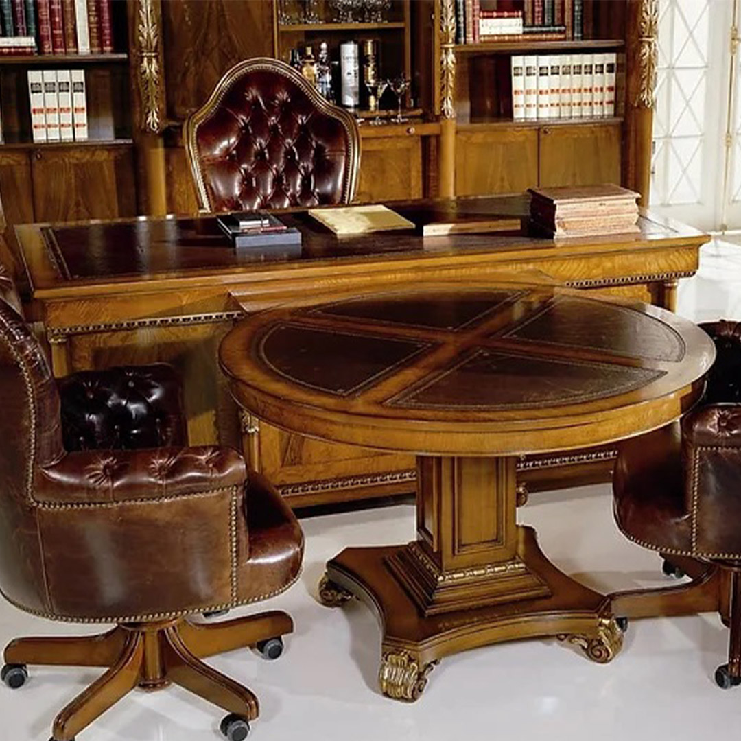 Ένα κλασικό γραφείο με θέση για PC και στρογγυλό τραπέζι συνδεδεμένο με το κεντρικό γραφείο. Ένα λιτό σχέδιο, διακοσμημένο με δέρμα στην κορυφή και στο κάλυμμα της καρέκλας. Ένας συνδυασμός στοιχείων που χαρακτηρίζουν τόσο μια αίθουσα συμβούλων όσο και ένα παραδοσιακό γραφείο.