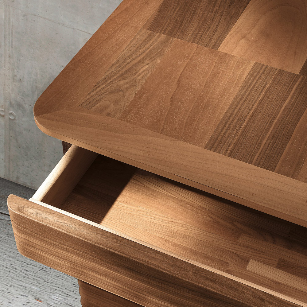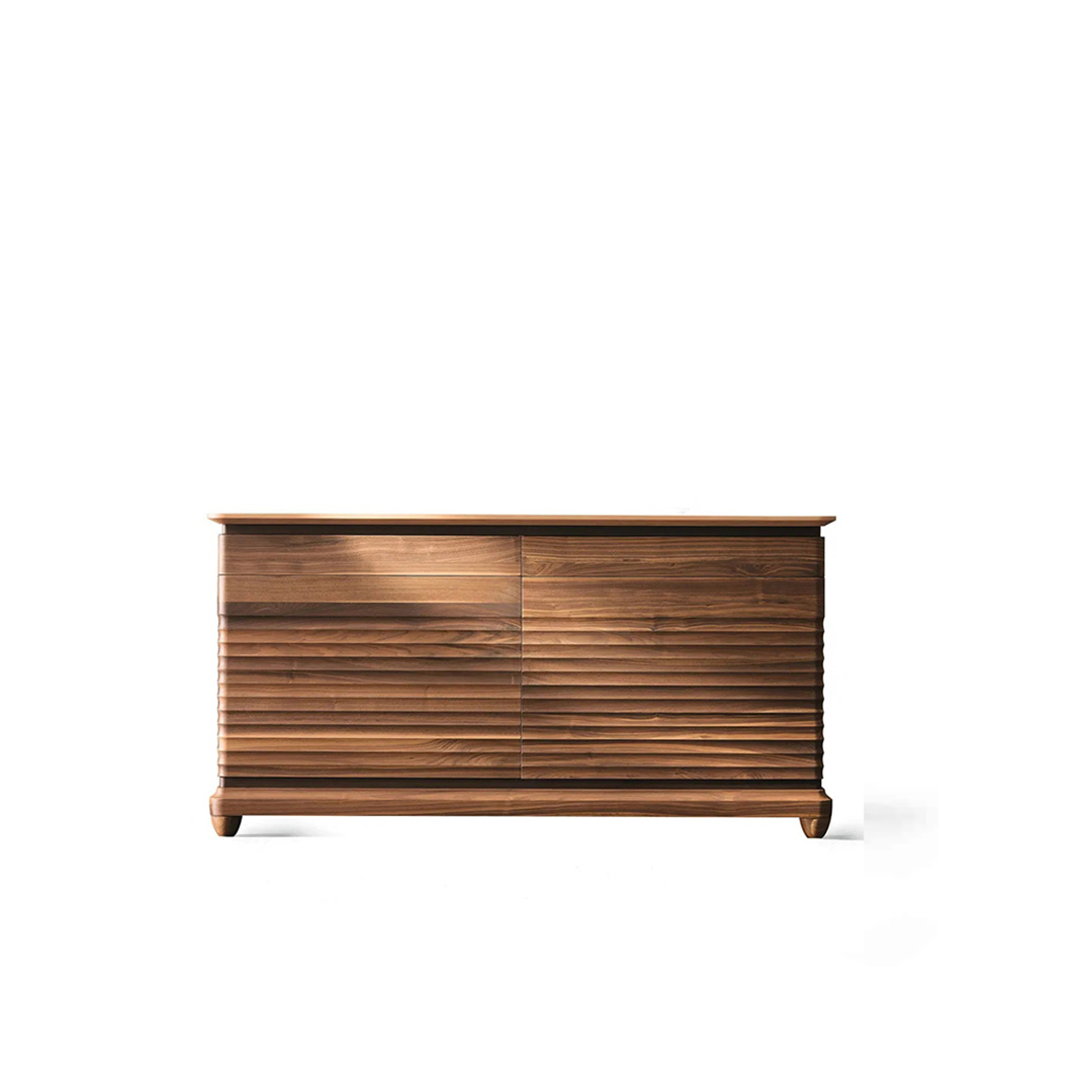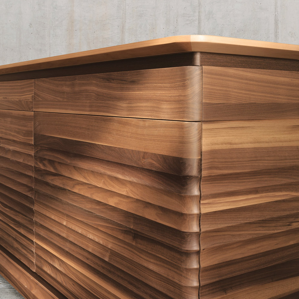 Σύγχρονο σχέδιο και κλασική αισθητική. Το λεπτό κυματιστό μπροστινό μέρος δημιουργεί μια εκλεπτυσμένη αντίθεση μεταξύ του φωτός και των σκιών: με αυτόν τον τρόπο, το ντουλάπι φαίνεται διαφορετικό ανάλογα με την γωνία. Κατασκευασμένο χειροποίητα στην Ιταλία με μασίφ καρυδιά canaletto, μπορεί να προσαρμοστεί για να δημιουργήσει ένα μοναδικό κομμάτι. Διατίθεται σε δύο εκδόσεις: με δύο πόρτες και δύο συρτάρια ή δύο εσωτερικές θήκες με ξύλινα ράφια.