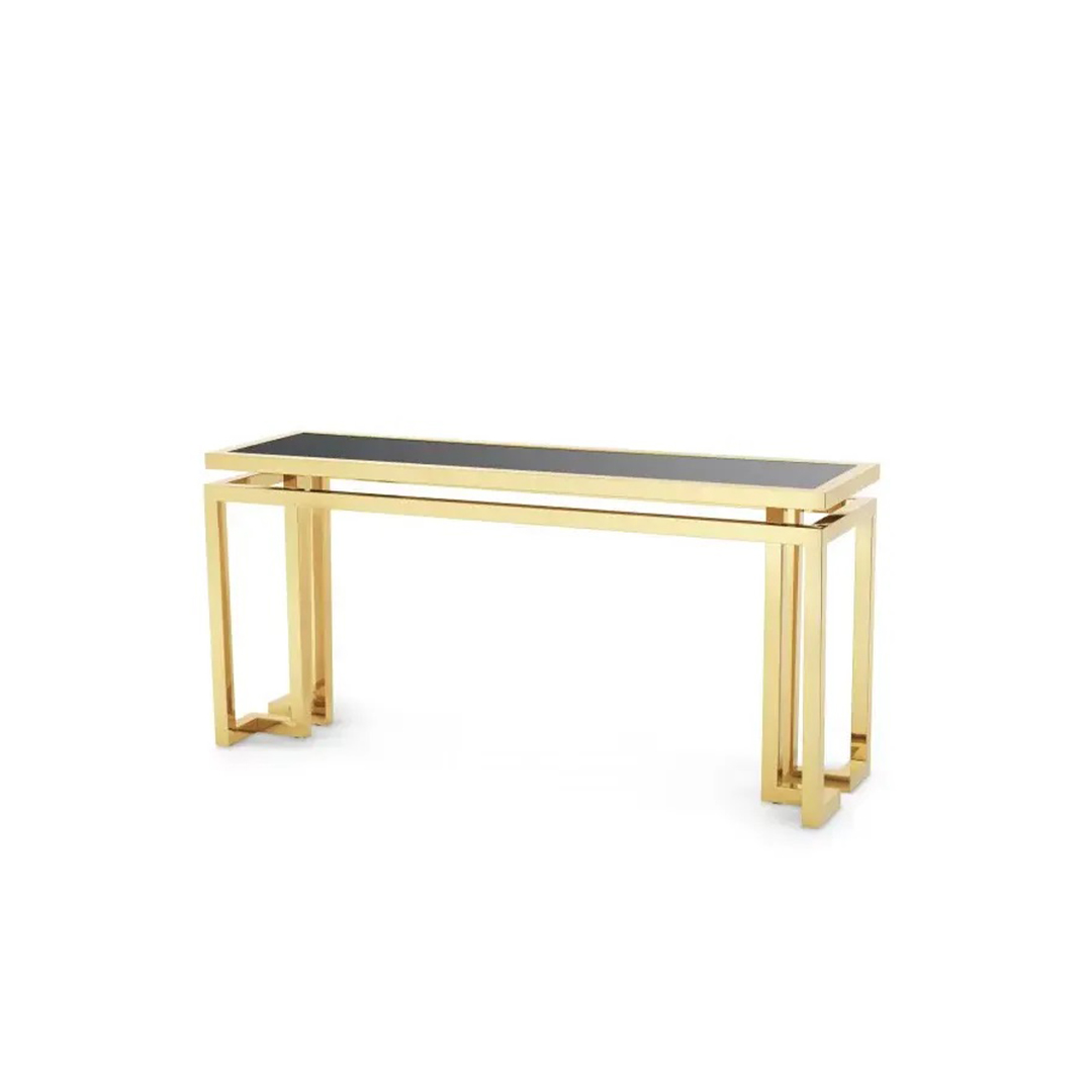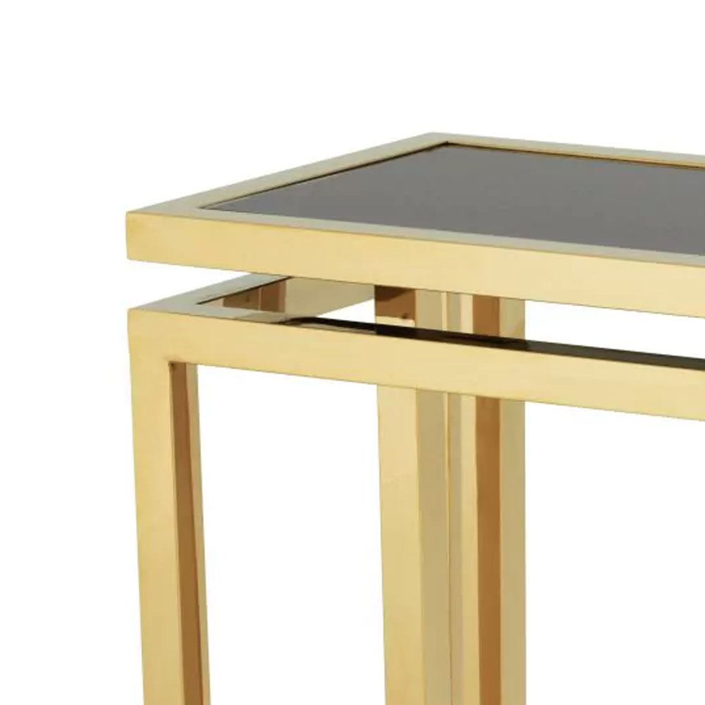 Ξαναζήστε το απαράμιλλο μεγαλείο της εποχής του Art Deco με το τραπέζι κονσόλας Palmer. Κατασκευασμένο από ανοξείδωτο ατσάλι, διαθέτει γυαλιστερό χρυσό φινίρισμα και επιτραπέζιο μαύρο γυαλί. Κάθε στοιχείο είναι ένα εντυπωσιακό, φτιαγμένο στο χέρι με σχολαστικά από έμπειρους τεχνίτες.