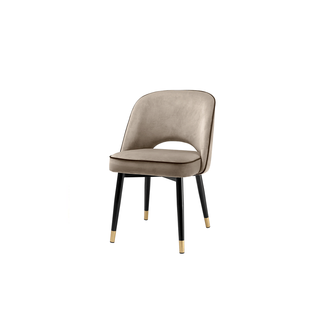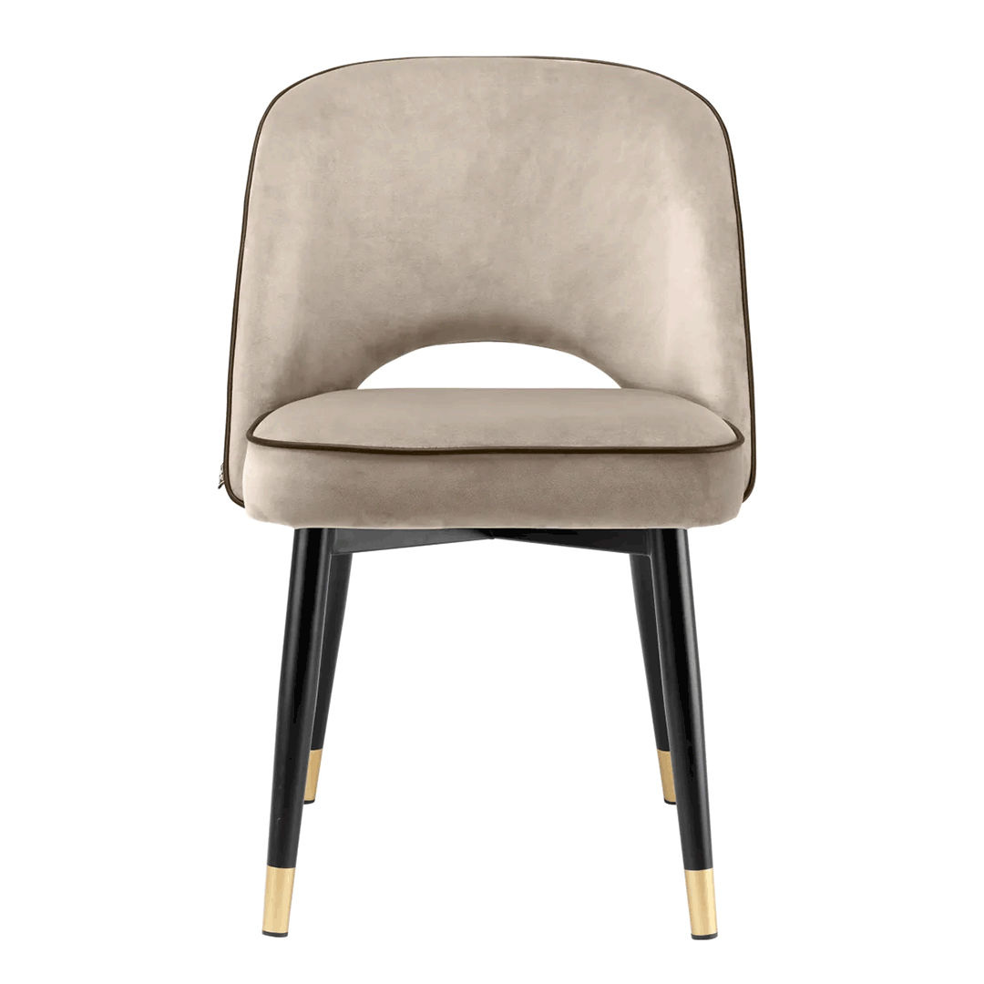Με μαύρα κωνικά πόδια και χρυσές λεπτομέρειες στις άκρες, ο στιβαρός σκελετός της διαθέτει πλάτη χωρίς μπράτσα, ανοιχτή στο κάτω μέρος πάνω από το κάθισμα. Οι κομψές γραμμές της αναδεικνύονται με μαύρες λεπτομέρειες από τεχνητό δέρμα.