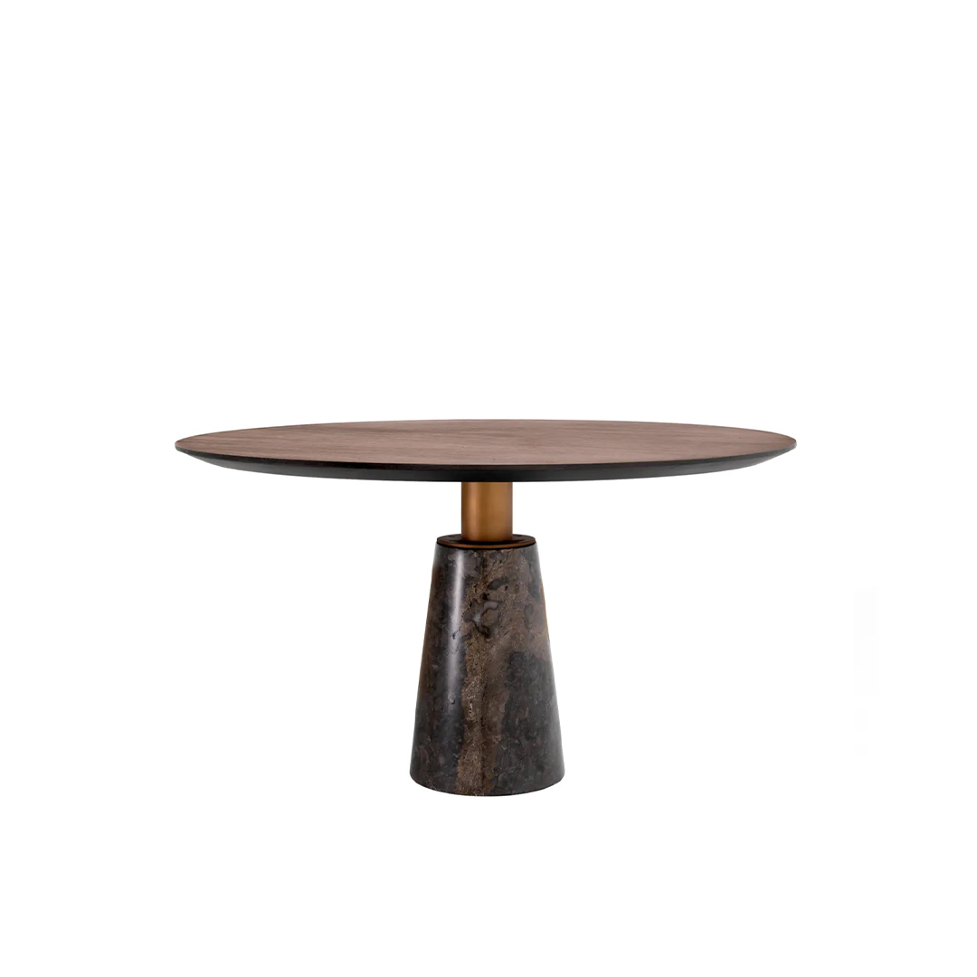 Με επιτραπέζιο καπλαμά δρυς μόκα και γκρι μαρμάρινη βάση, αυτή η στρογγυλή τραπεζαρία ταιριάζει απόλυτα με μοντέρνα διακόσμηση.