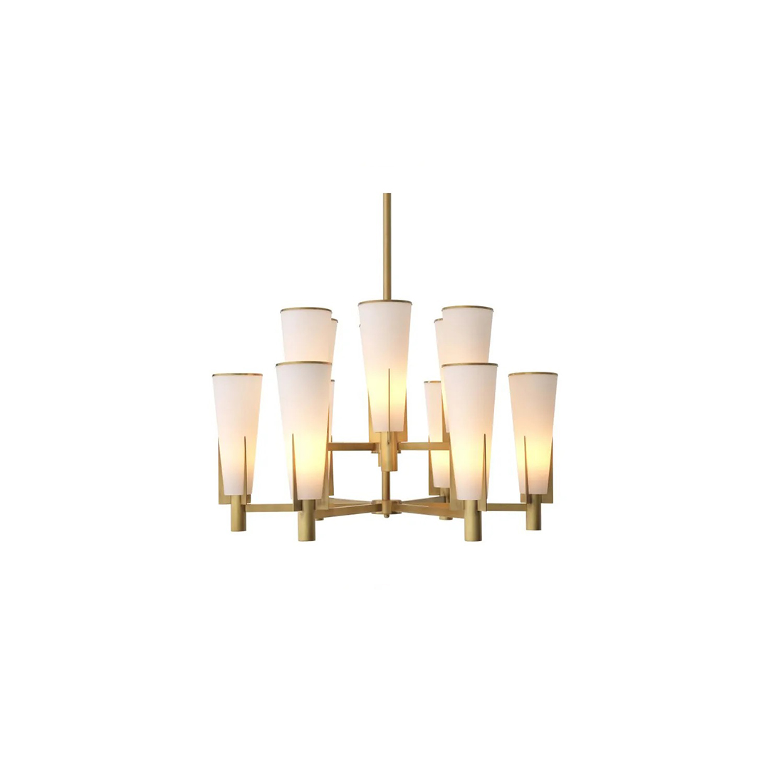 Chandelier Dino με φινίρισμα από ορείχαλκο αντίκα σε γεωμετρικό σχέδιο, κατασκευασμένο από λευκό γυαλί διακοσμημένο με αντικέ ορειχάλκινο χείλος και αρχιτεκτονικές αποχρώσεις σε σχήμα κώνου.