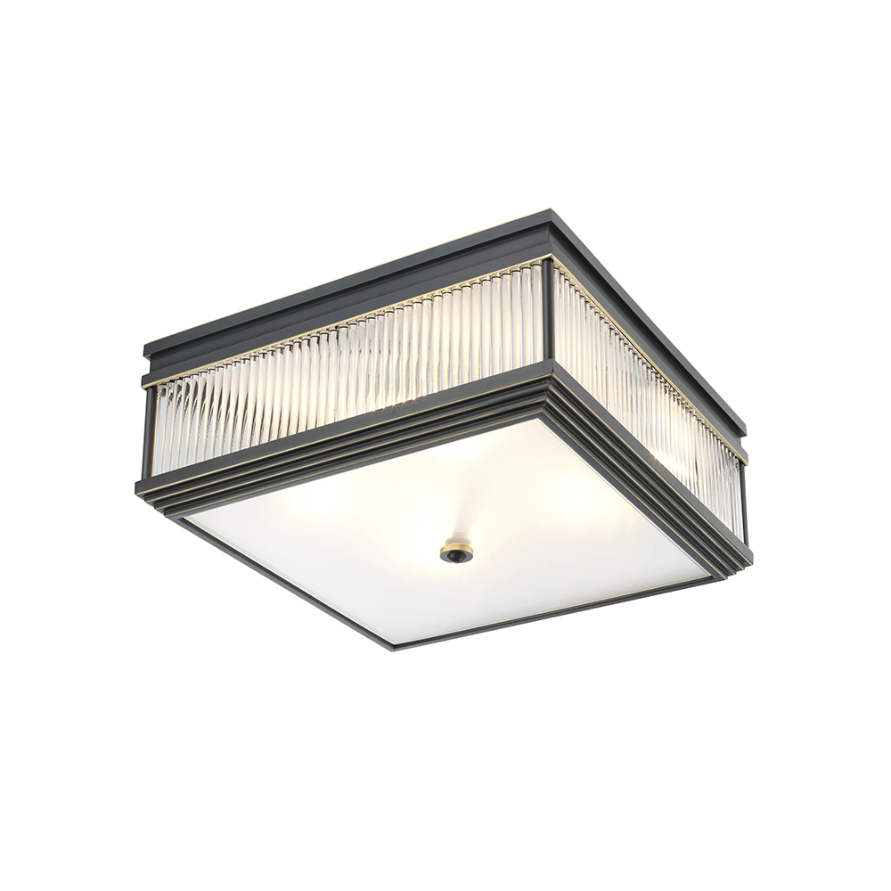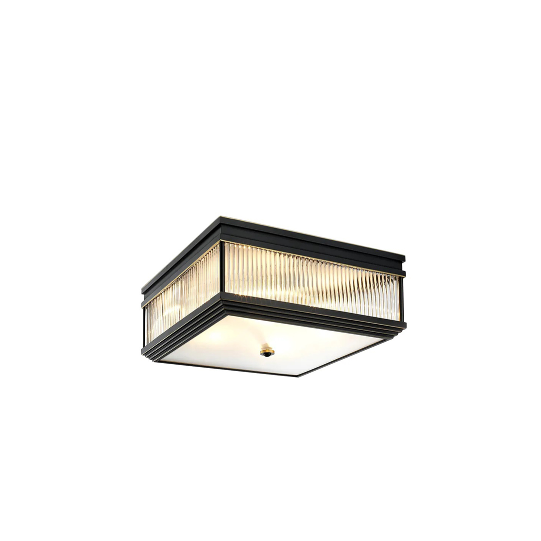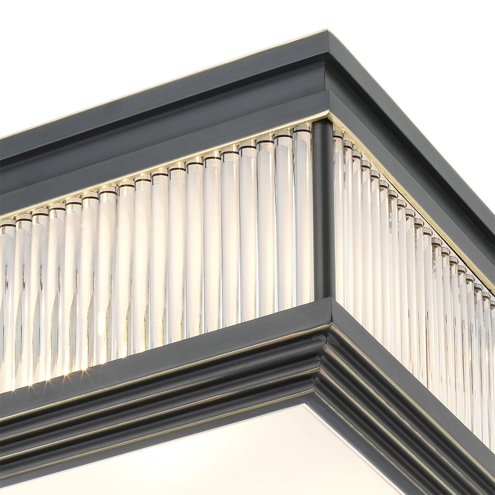 Το φωτιστικό οροφής έχει φινίρισμα αντικέ από ορείχαλκο, ράβδους από διαφανές γυαλί στα πλαϊνά πάνελ του τετράγωνου πλαισίου.