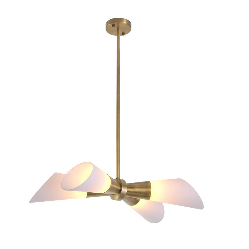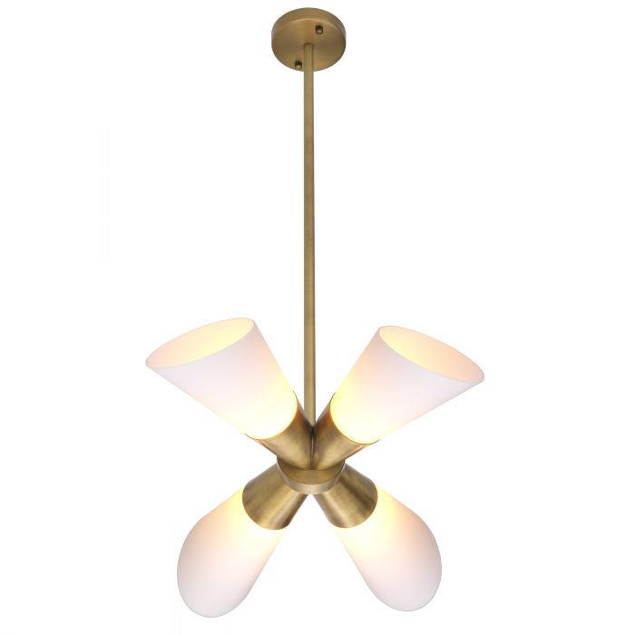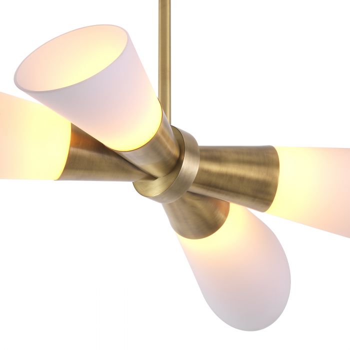 Φωτιστικό Οροφής Papillon σε σχήμα κώνου από λευκό γυαλί με φινίρισμα από ορείχαλκο αντίκα. Με τις παρεχόμενες ράβδους των 30, 50 και 70 cm, το ύψος μπορεί να καθοριστεί σύμφωνα με τις επιθυμίες σας.