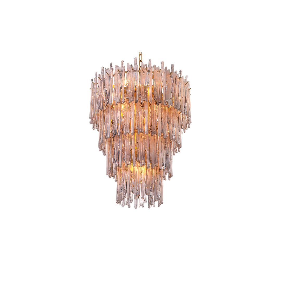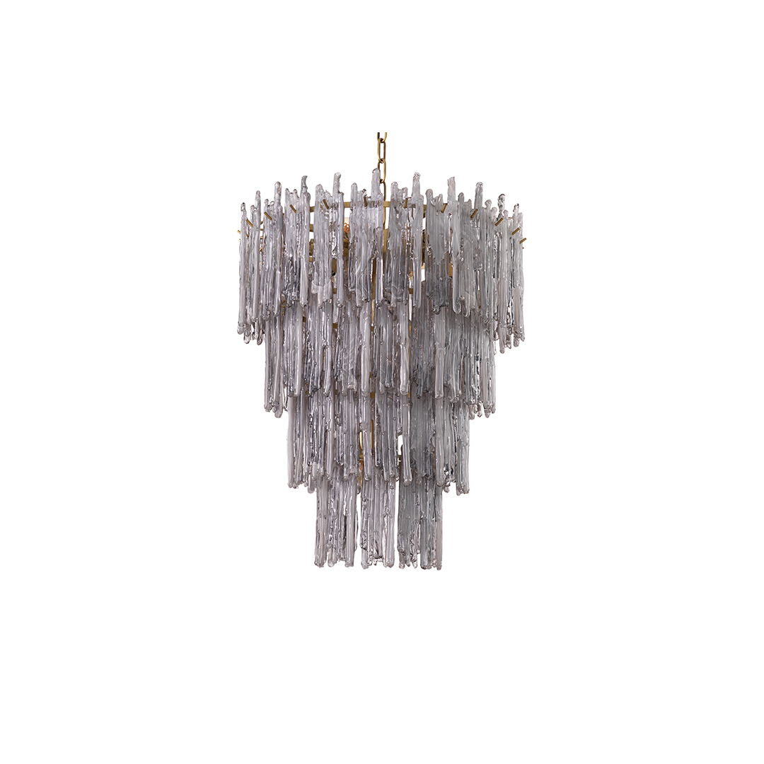 Στέψτε το διάδρομο, το σαλόνι ή την τραπεζαρία σας με το Chandelier Saint Roch S. Αυτό το υπέροχο κωνικό μενταγιόν οροφής με φινίρισμα από ορείχαλκο έχει πέντε επίπεδα με διακοσμητικά από καπνογόνo γυαλί. Λόγω ειδικής επεξεργασίας, το ποτήρι καπνού έχει αποτέλεσμα που στάζει, κάνοντας τους κρυστάλλους να μοιάζουν με παγάκια. Δημιουργήστε ένα σύμπλεγμα από μεγάλους και μικρούς πολυελαίους Saint Roch για μια μαγική ατμόσφαιρα.