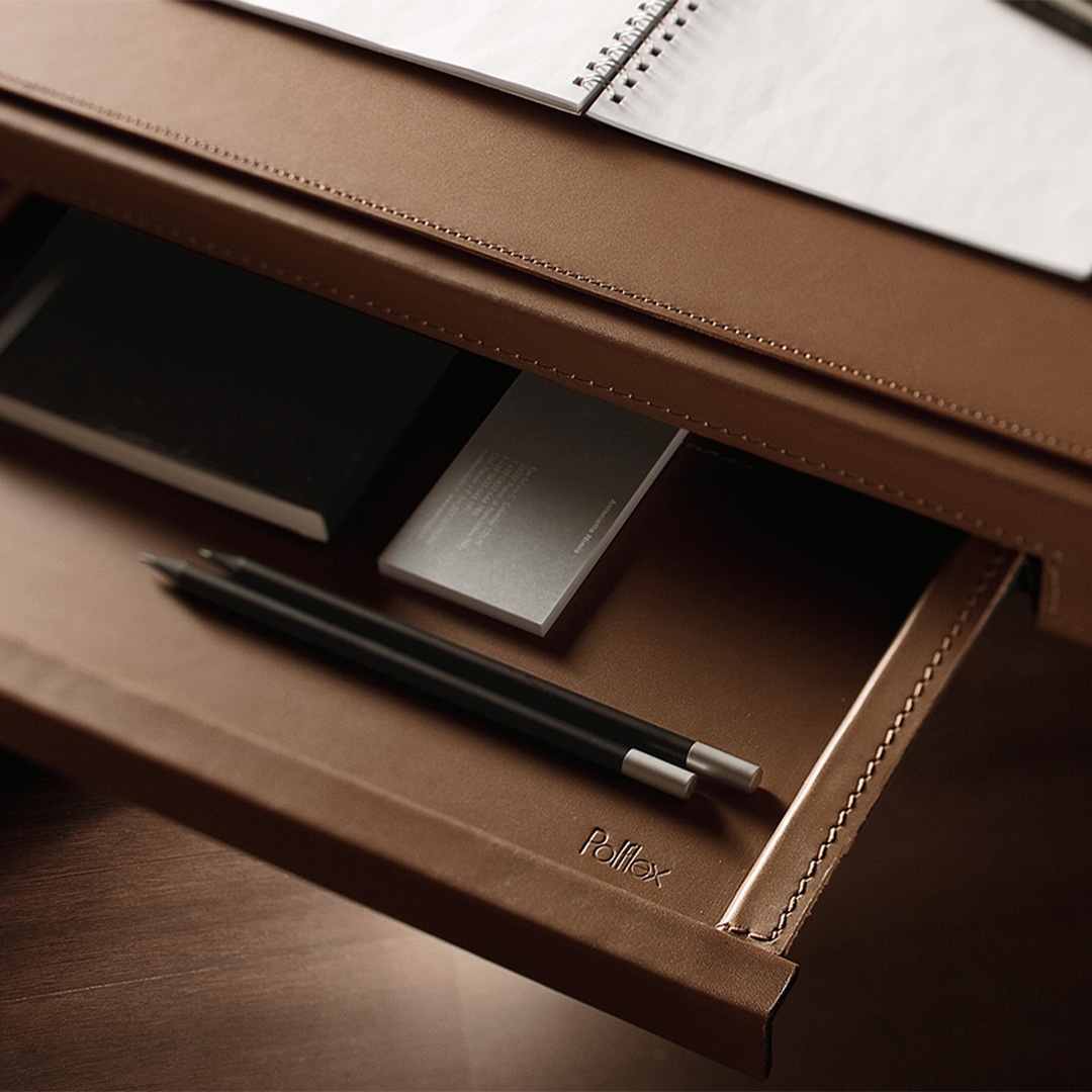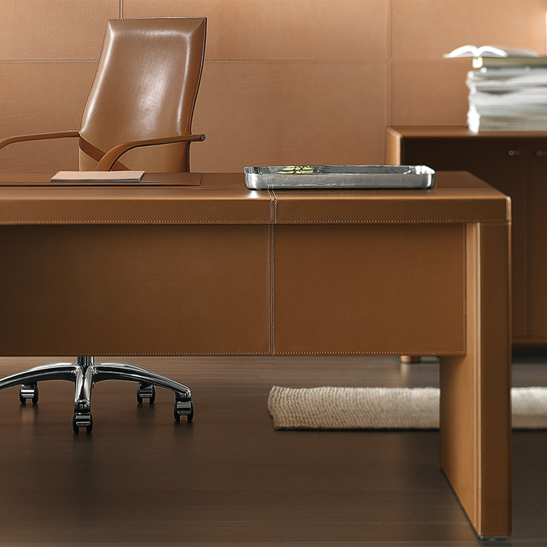 Executive γραφείο με σκληρό δερμάτινο συρτάρι γραφικής ύλης και βάσεις με αγωγούς για δρομολόγηση καλωδίων. Πλήρως καλυμμένο με σκληρό δέρμα. Σχεδιαστής: F. Sordo Cilveti