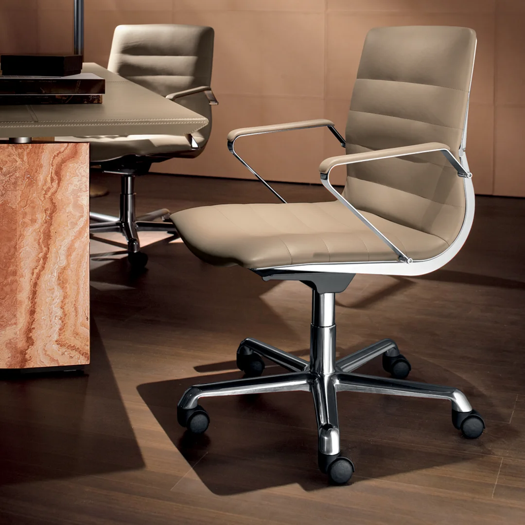 Η καρέκλα γραφείου Epico 503 είναι επενδεδυμένη με μαλακό δέρμα, ενώ τα μπράτσα της διατίθενται είτε πλήρως καλυμμένα με δέρμα είτε να συνδυαστούν με χρωμιωμένο αλουμίνιο. Η αρθρωτή δομή και η βάση από γυαλιστερό αλουμίνιο (διαθέσιμη και σε μαύρο λακαριστό φινίρισμα) προσφέρουν άνεση και κομψότητα. Διαθέτει λειτουργίες περιστροφής και ανάκλισης.