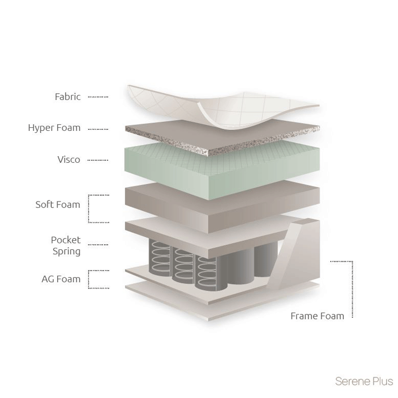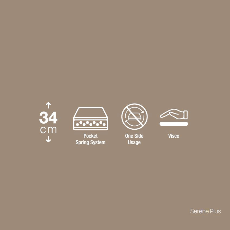 Διαθέτει σύστημα ελατηρίων Pocket spring πέντε τμημάτων που προσφέρει τέλεια χαλάρωση, ενώ υποστηρίζει απόλυτα την σπονδυλική στήλη. Χρησιμοποιώντας πλεκτό ύφασμα, ενσωματωμένο ανώστρωμα και αφρό Visco στα υψηλότερα 5 εκατοστά του στρώματος, το Serene plus εγγυάται μέγιστη άνεση.