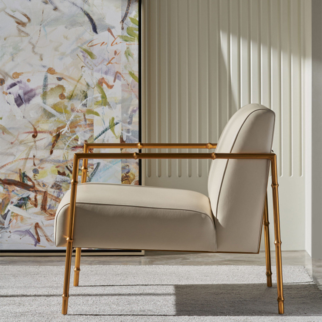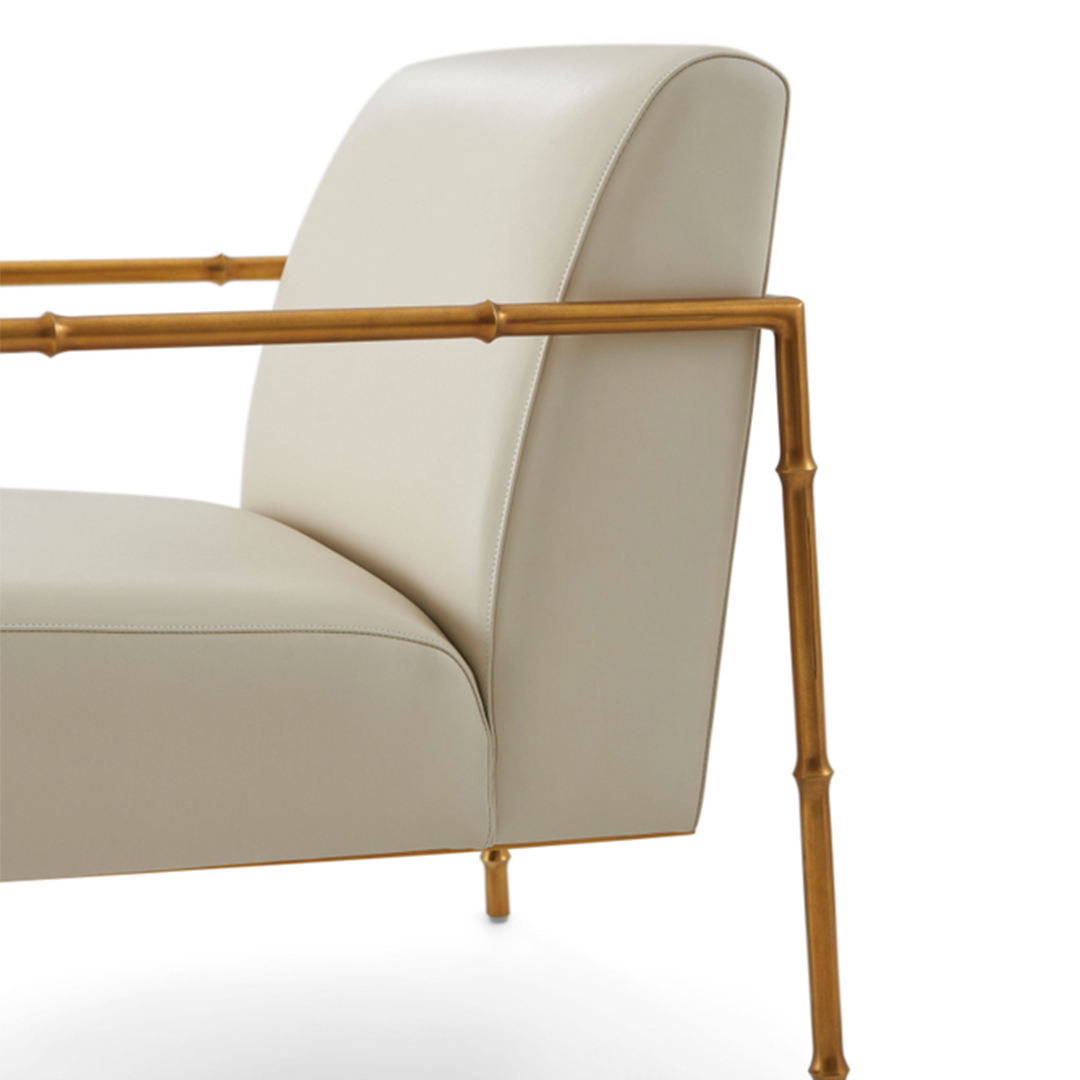 Μπράτσα που σχηματίζουν ένα ελαφρύ σχέδιο μπαμπού στην καρέκλα Kesden Accent. Μεταλλική βάση κι επενδυμένο κάθισμα από δέρμα.