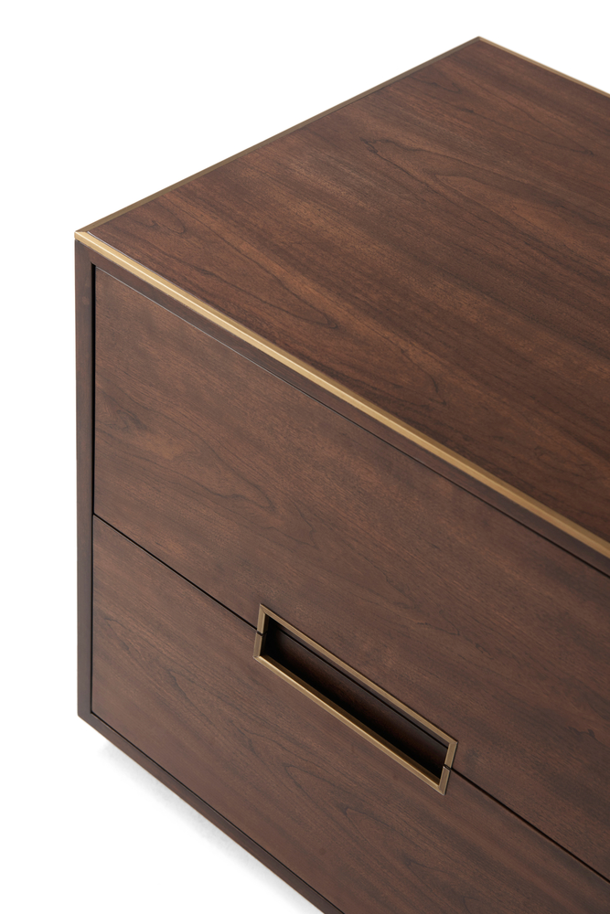 Κομοδίνο από καπλαμά κερασιάς, σε φινίρισμα Almond, με ένθετες χειρολαβές στα δυο συρτάρια και πλαίσιο στο καπάκι, από βουρτσισμένο πυρίτη.