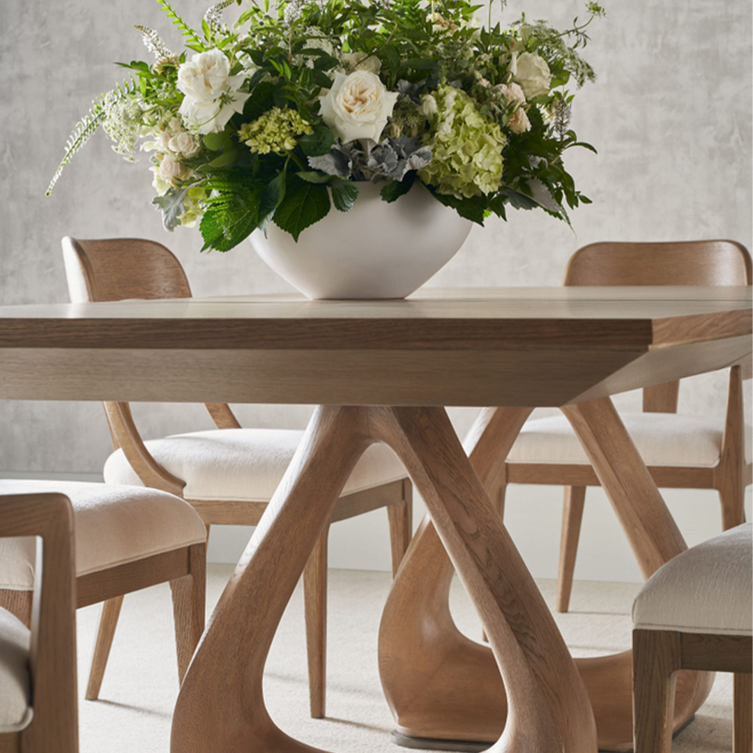 Οι απαλές, απαλές γραμμές αποκαλύπτουν τη φυσική κομψότητα της λευκής βελανιδιάς στο τραπέζι φαγητού Essence. Ένα έργο λειτουργικής τέχνης, επεκτεινόμενο πάνω μέρος, αυτό το τραπέζι στηρίζεται σε μεταλλική βάση.