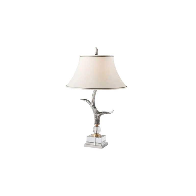 Επιτραπέζια λάμπα με κορμό κέρατου, από ανοξείδωτο χάλυβα, στηριζόμενη σε γυάλινη σφαίρα. Γυάλινη κυβιστική βάση & υφασμάτινο καπέλο.