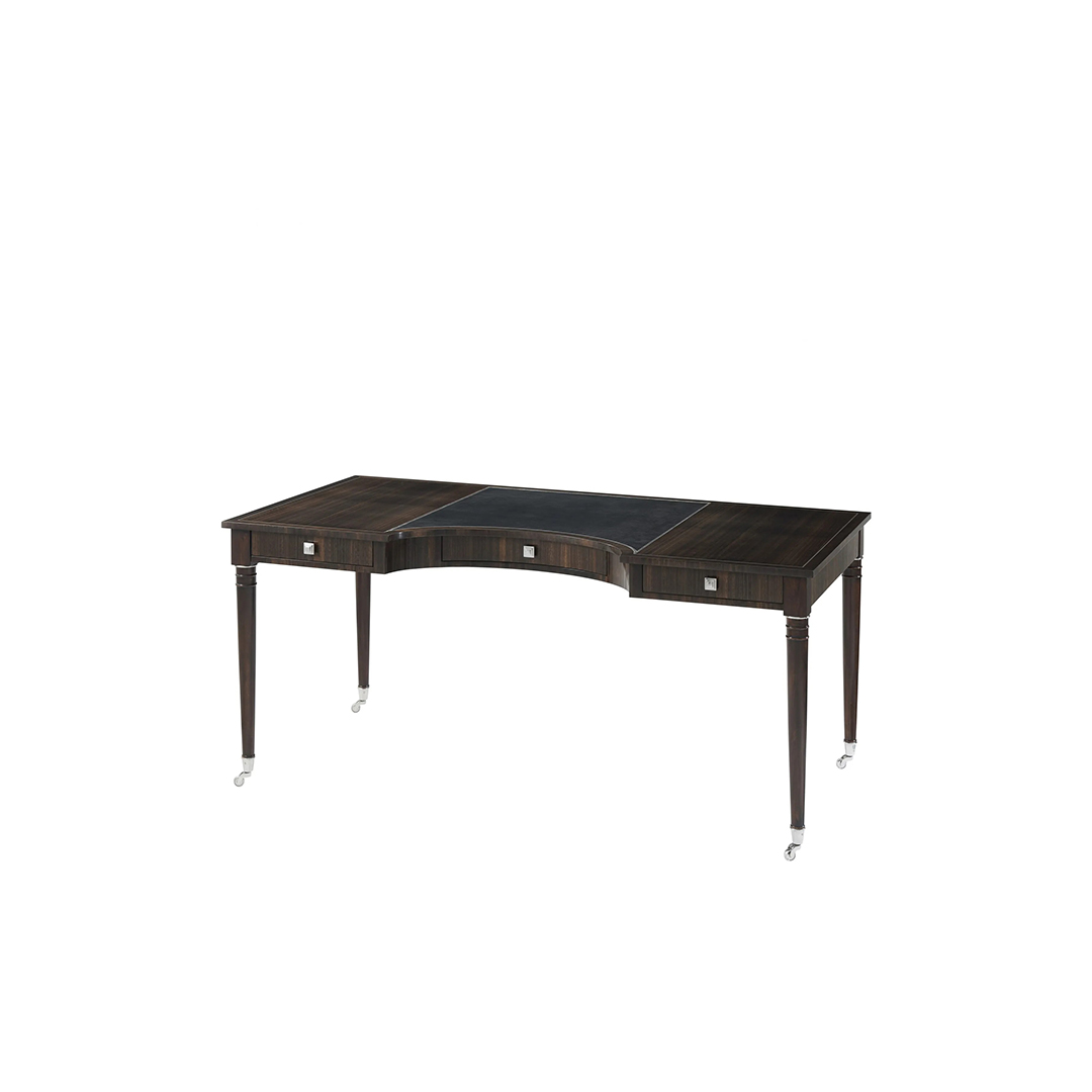 Γραφείο από ξύλο ευκαλύπτου και με δέρμα στην κεντρική του επιφάνεια ,στην οποία δημιουργείται ημικυκλική κοπή.Λαβές από ανοξείδωτο ατσάλι στα τρία συρτάρια και λεπτομέρειες ανοξείδωτου χάλυβα στα κυλινδρικά πόδια του.