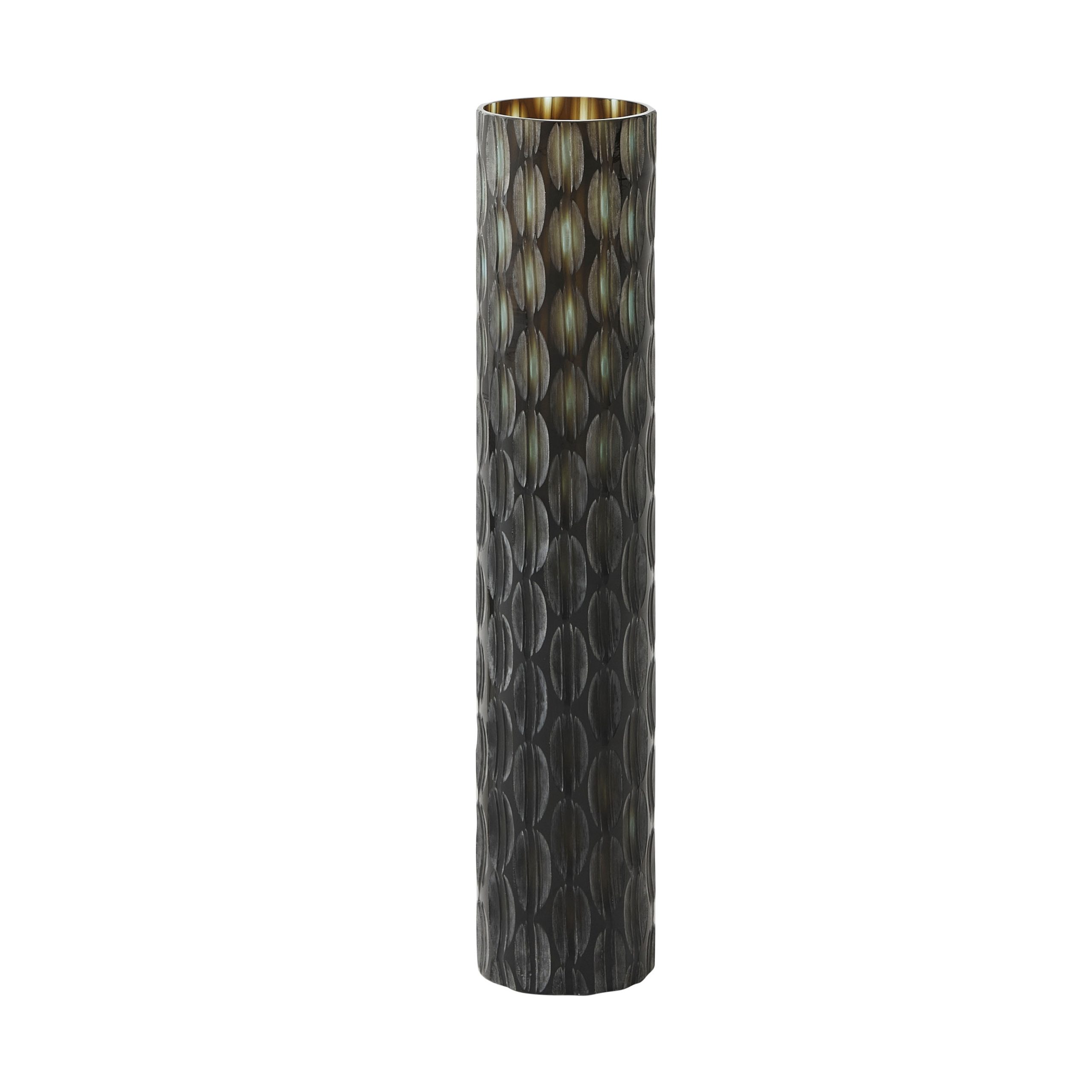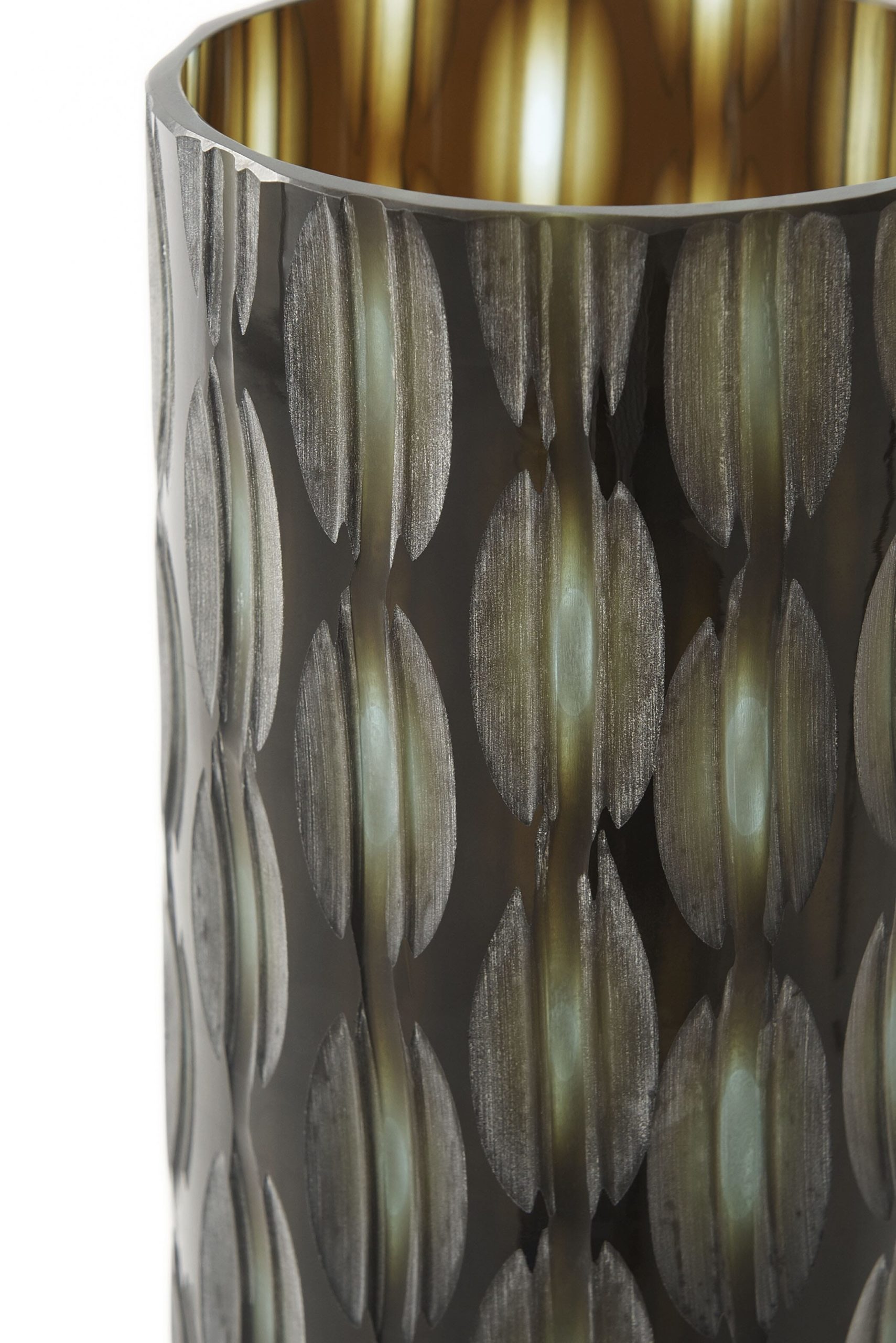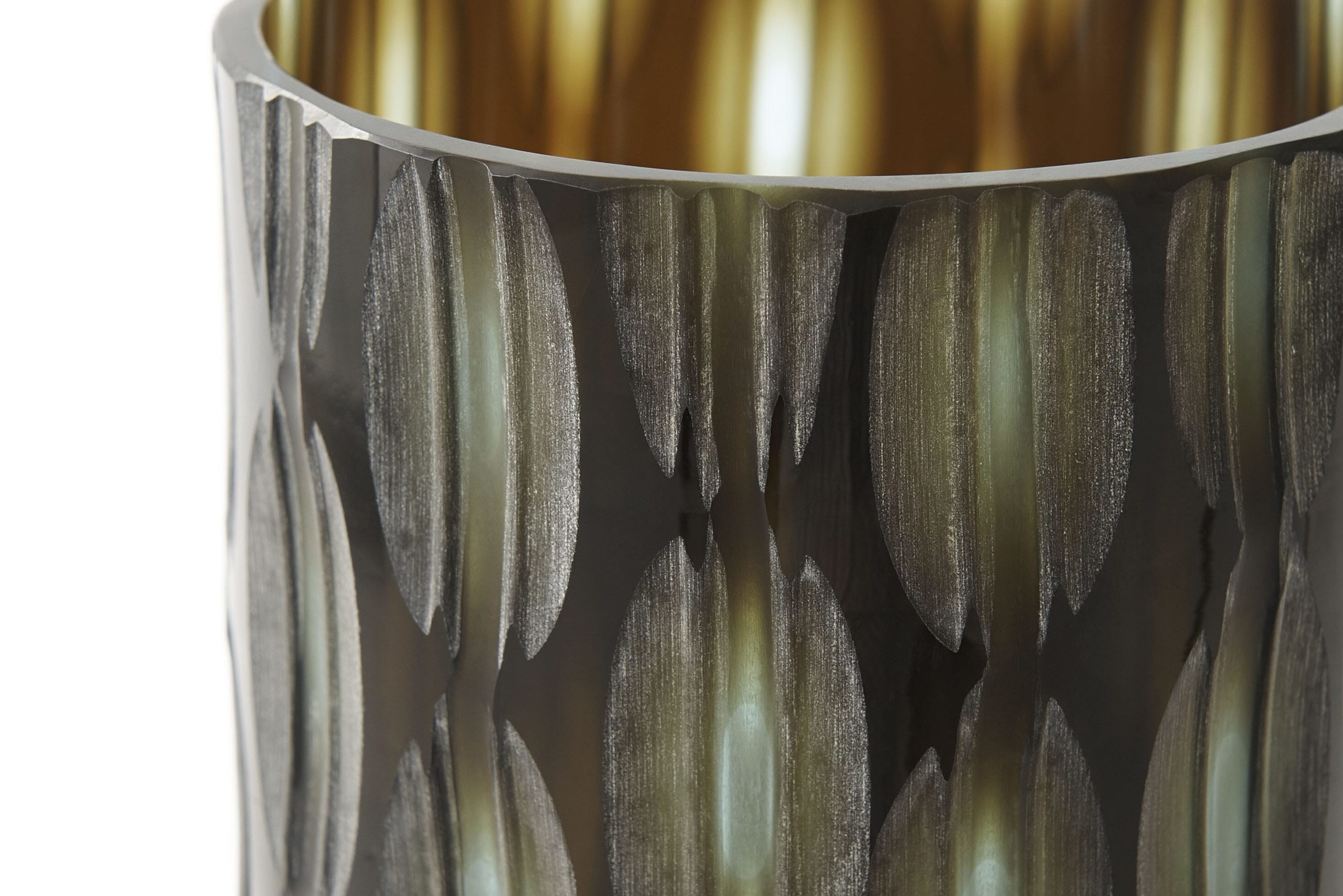 Ψηλό γαλάζιο γυάλινο βάζο με τιρκουάζ ρίγες και χειροποίητη διακόσμηση. Replica από αυθεντικό Art Deco στυλ.