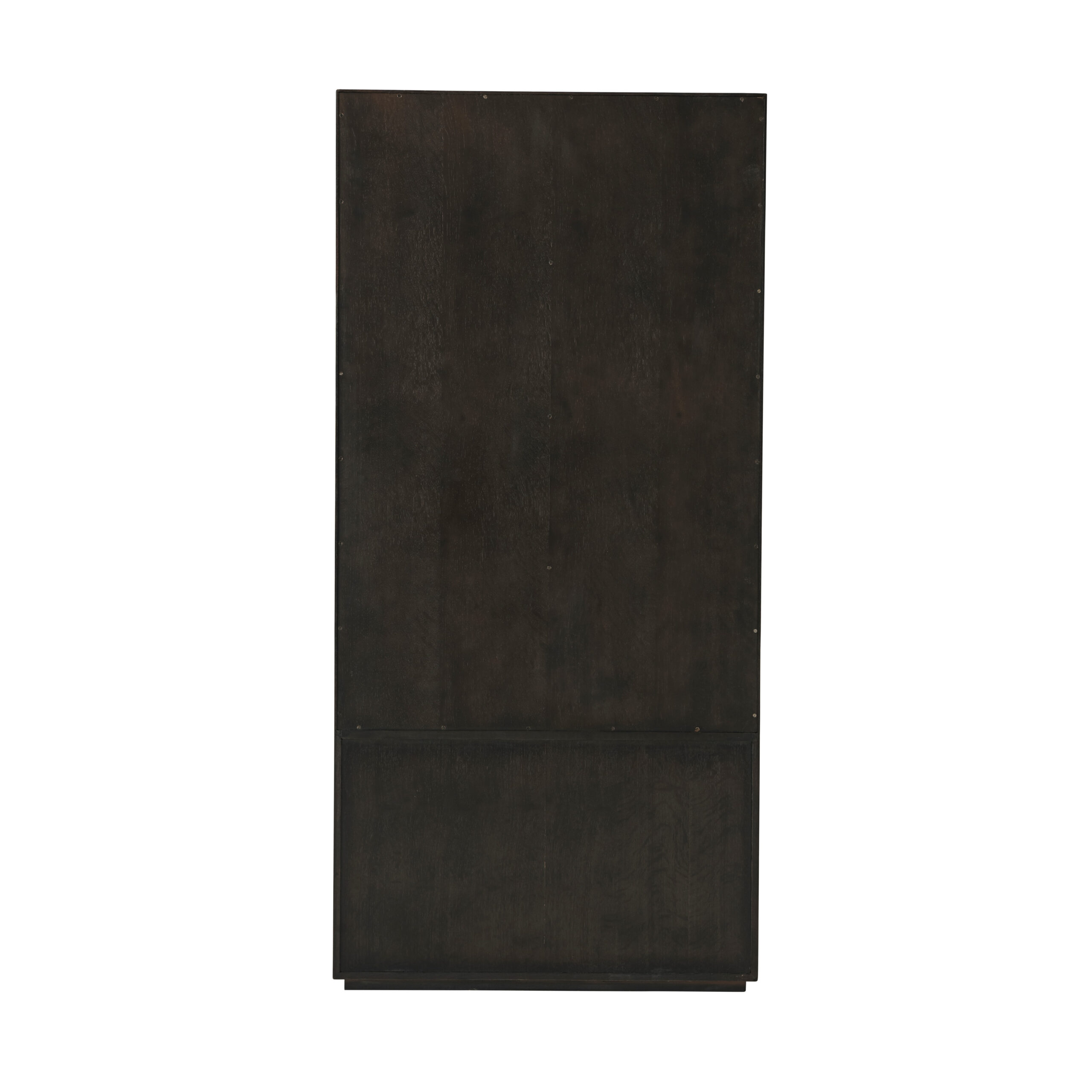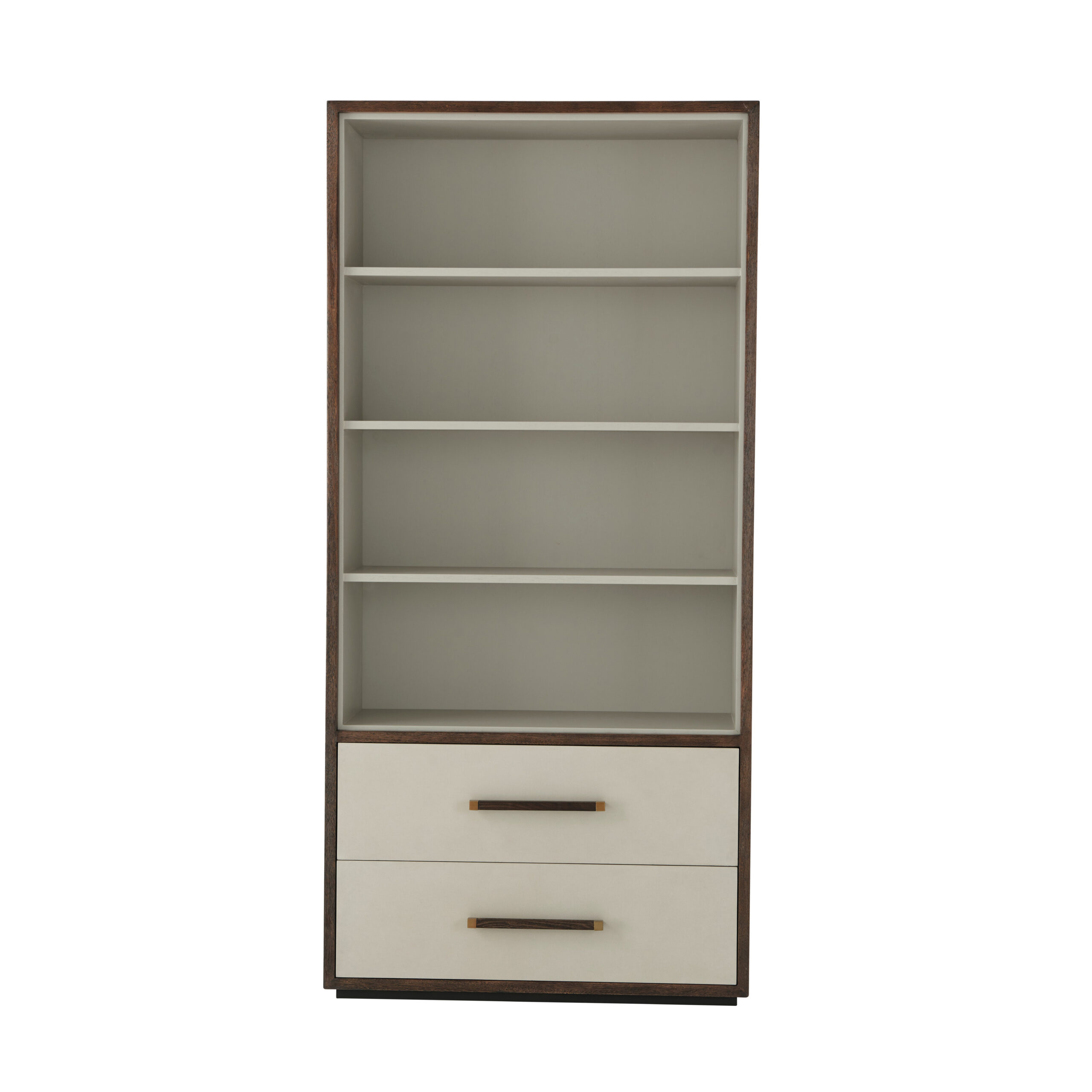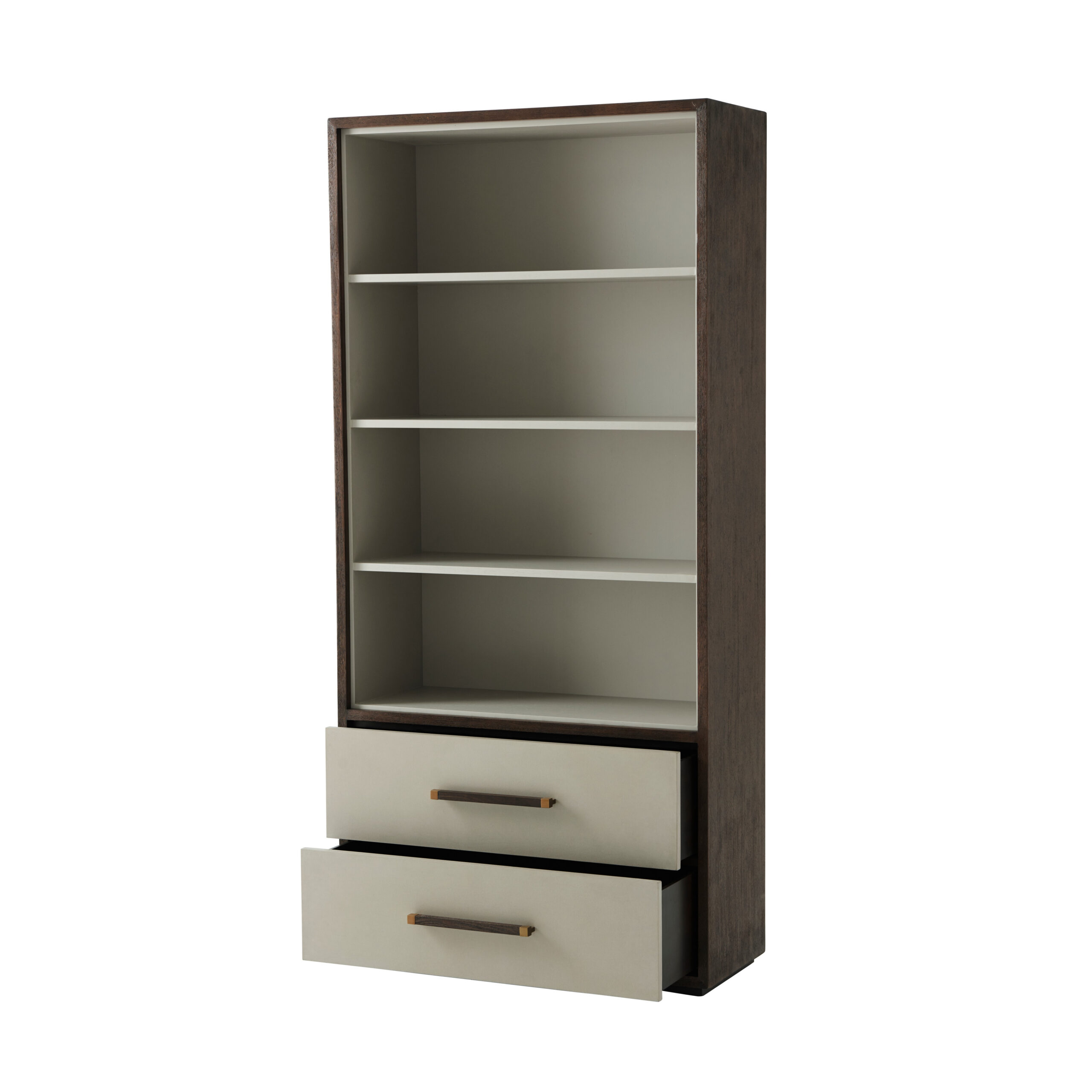 Βιβλιοθήκη με φινίρισμα λάκας στο εσωτερικό, δυο συρτάρια με δερμάτινη επένδυση, καπλαμάς Lati με φινίρισμα Cardamon (στις εσωτερικές πλευρές και στις χειρολαβές) και παλαιωμένες ορειχάλκινες λεπτομέρειες.