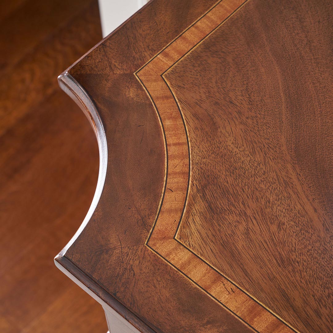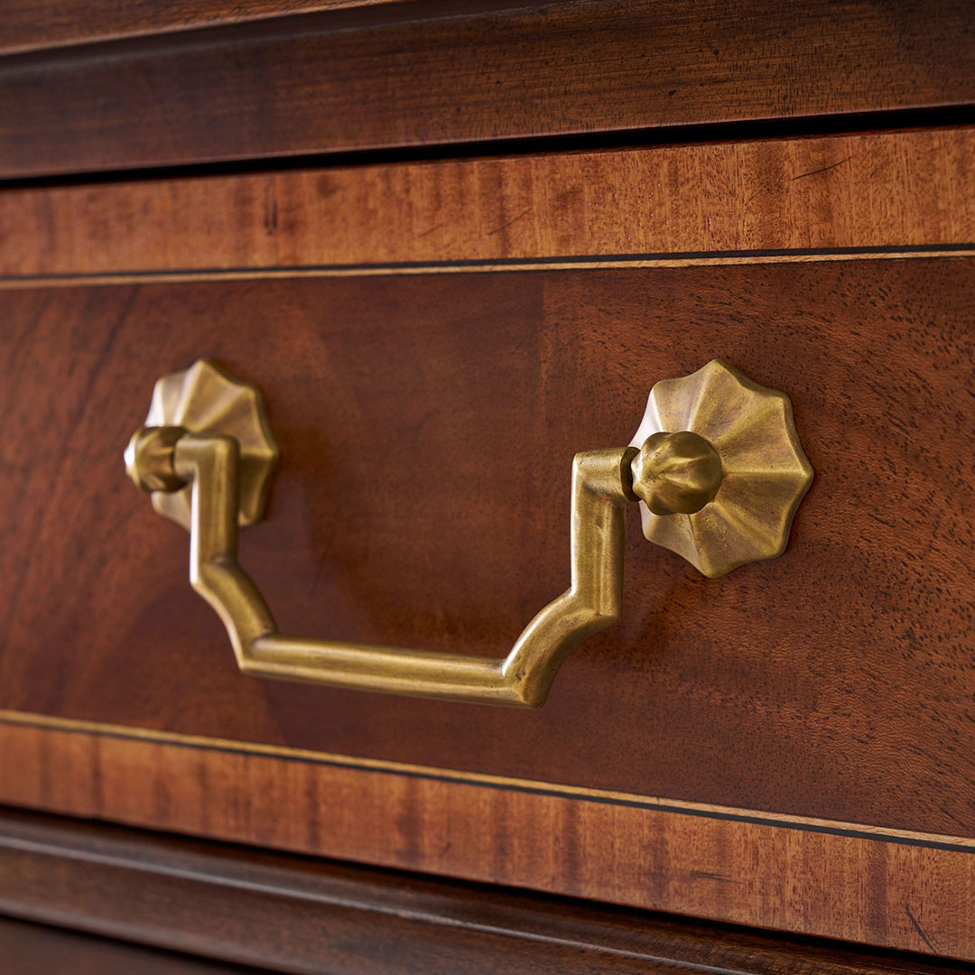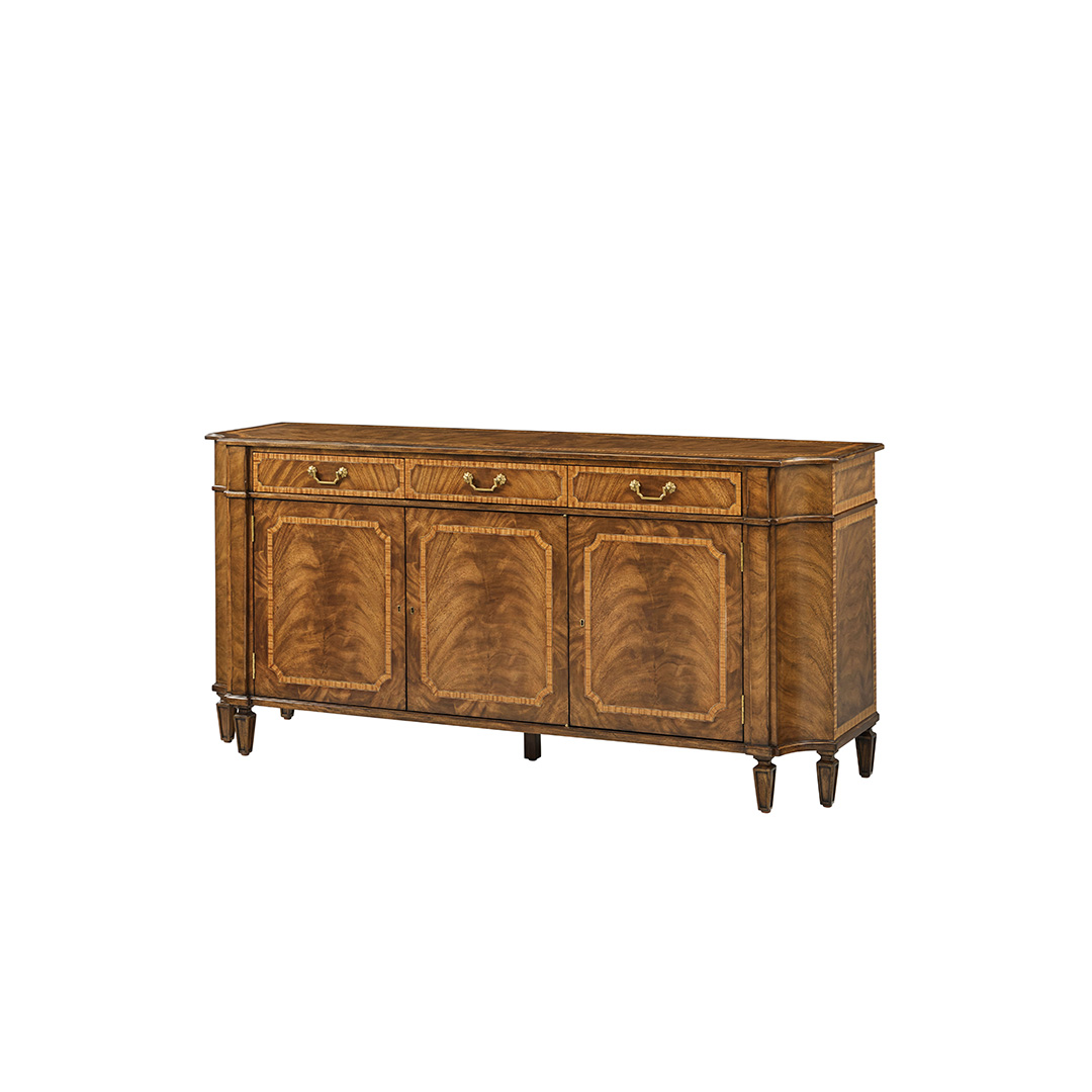 Ένας μεγαλοπρεπής κυματισμός khaya τραβάει την προσοχή στην επιφάνεια και το σώμα του τρίθηρου μπουφέ Sloane. Χειροποίητος από ξύλα khaya και makore. Τελειωμένος σε Edwardian Brown.