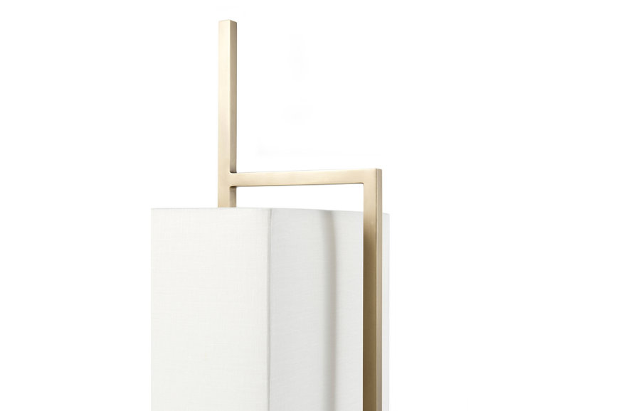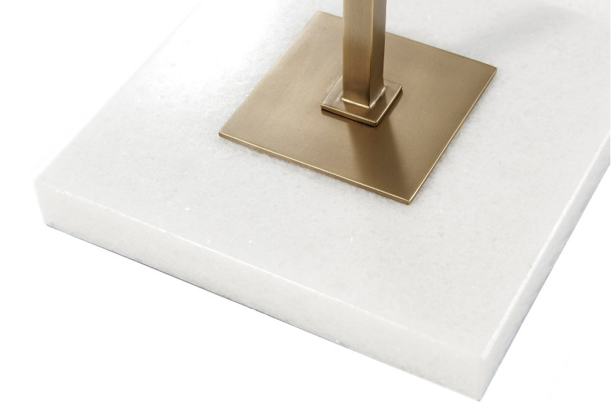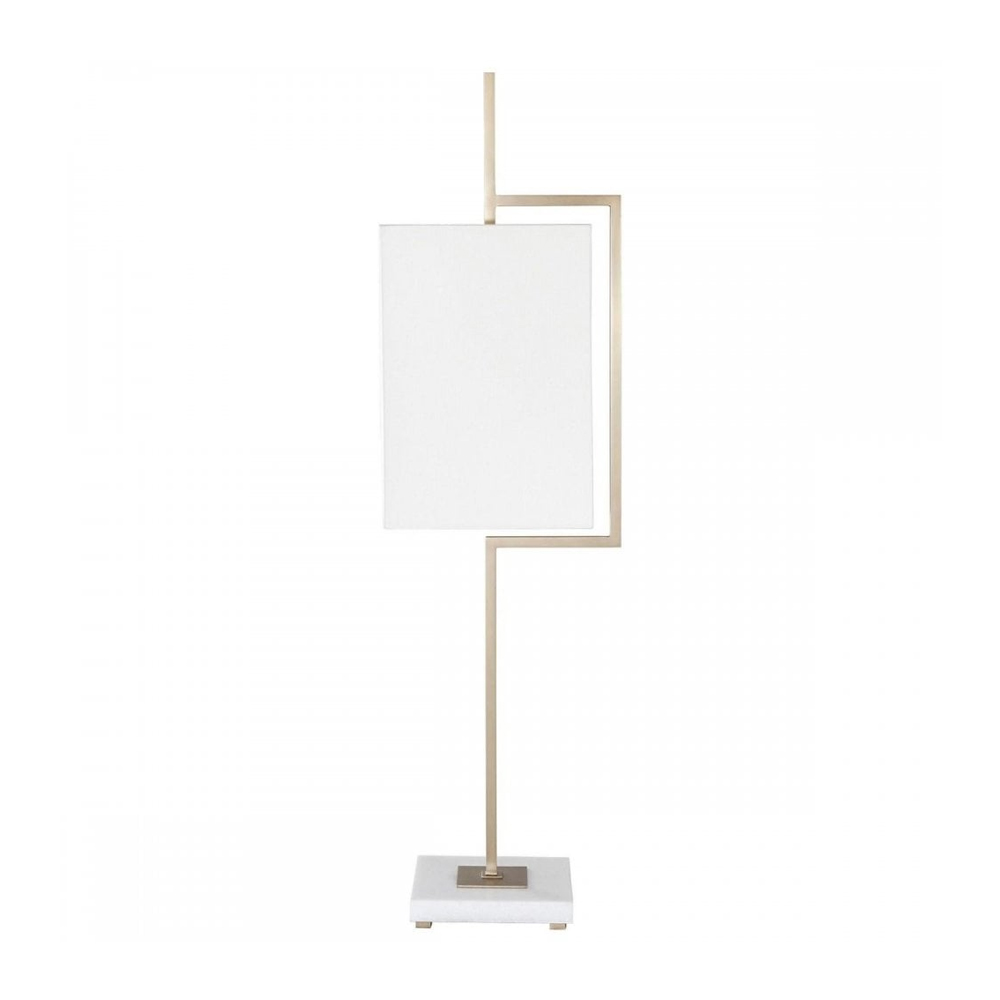 Επιτραπέζιο φωτιστικό από παλαιωμένο ορείχαλκο, με παραλληλόγραμμο υφασμάτινο καπέλο. Βάση από λευκό μάρμαρο Carrara και ορείχαλκο.