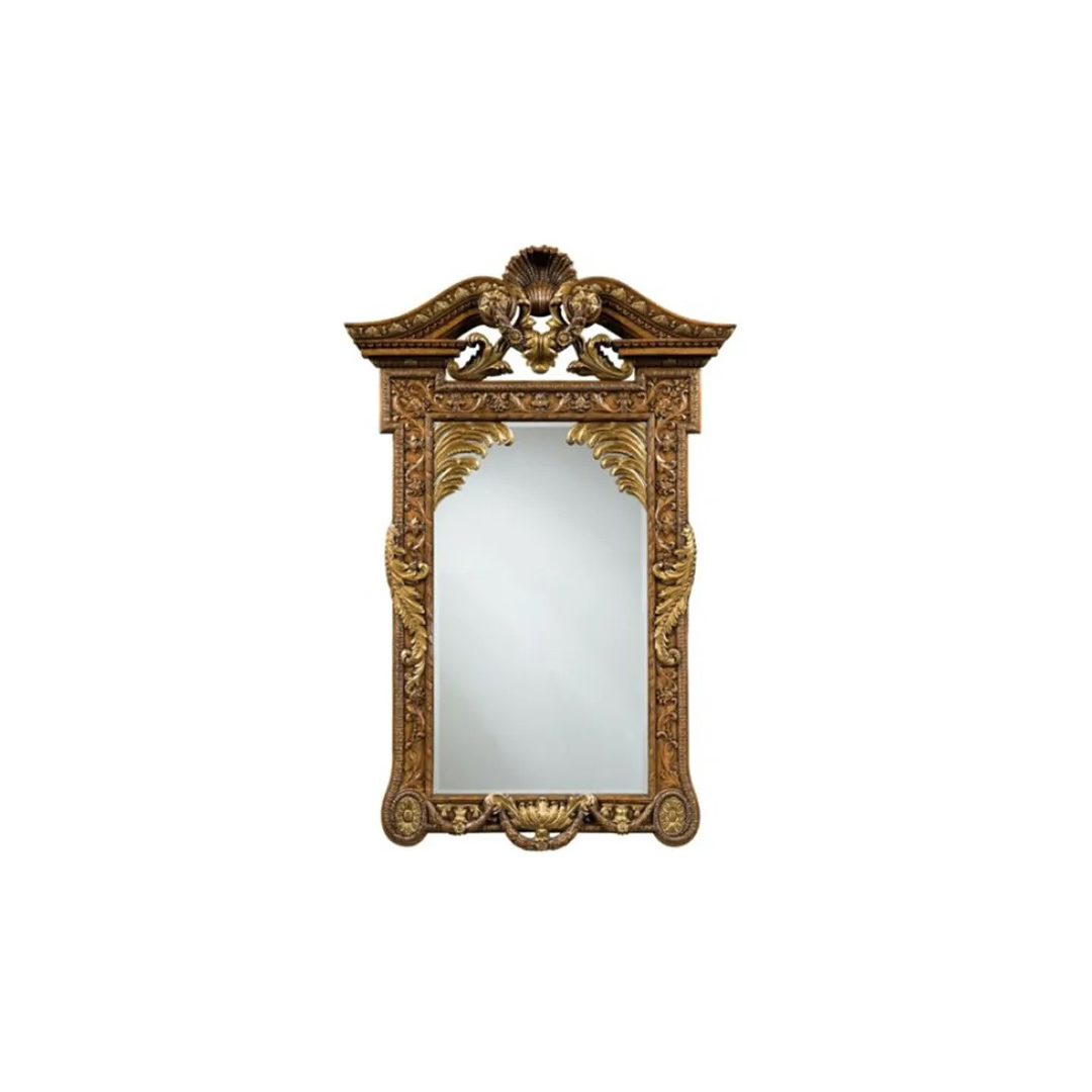 Ορθογώνιος χειροποίητος σκαλιστός καθρέπτης, με ανθισμένο αμπέλι & επιχρυσωμένα φύλλα από φοίνικα, εισβάλλουν από την κορνίζα στον καθρέπτη. Ανάμεσα στα σκαλιστά αετώματα, φύλλα acanthus και ένα μεγάλο κοχύλι.