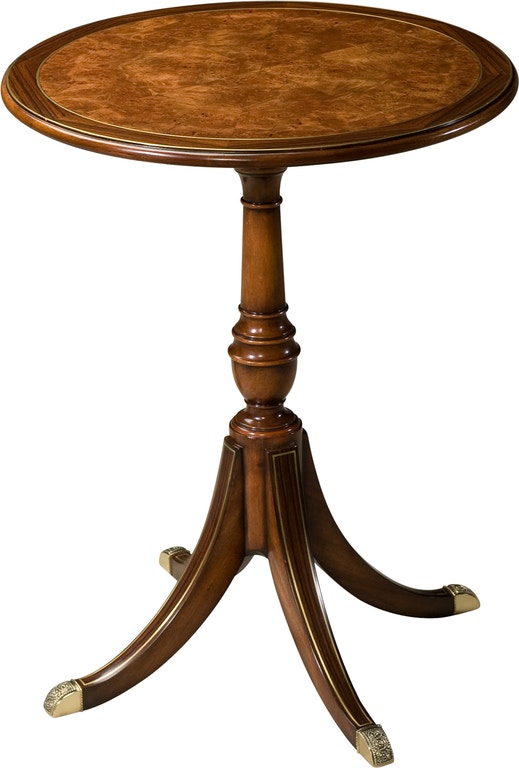 Τραπέζι πλαϊνό, από καπλαμά ρίζας σφενδάμου & τριανταφυλλιάς, με ένθετο ορειχάλκινο κυκλικό πλαίσιο στο καπάκι. Λεπτομέρεια από ορειχάλκινα τελειώματα στα λεπτά πόδια. Εμπνευσμένο από αυθεντικό George III στυλ.