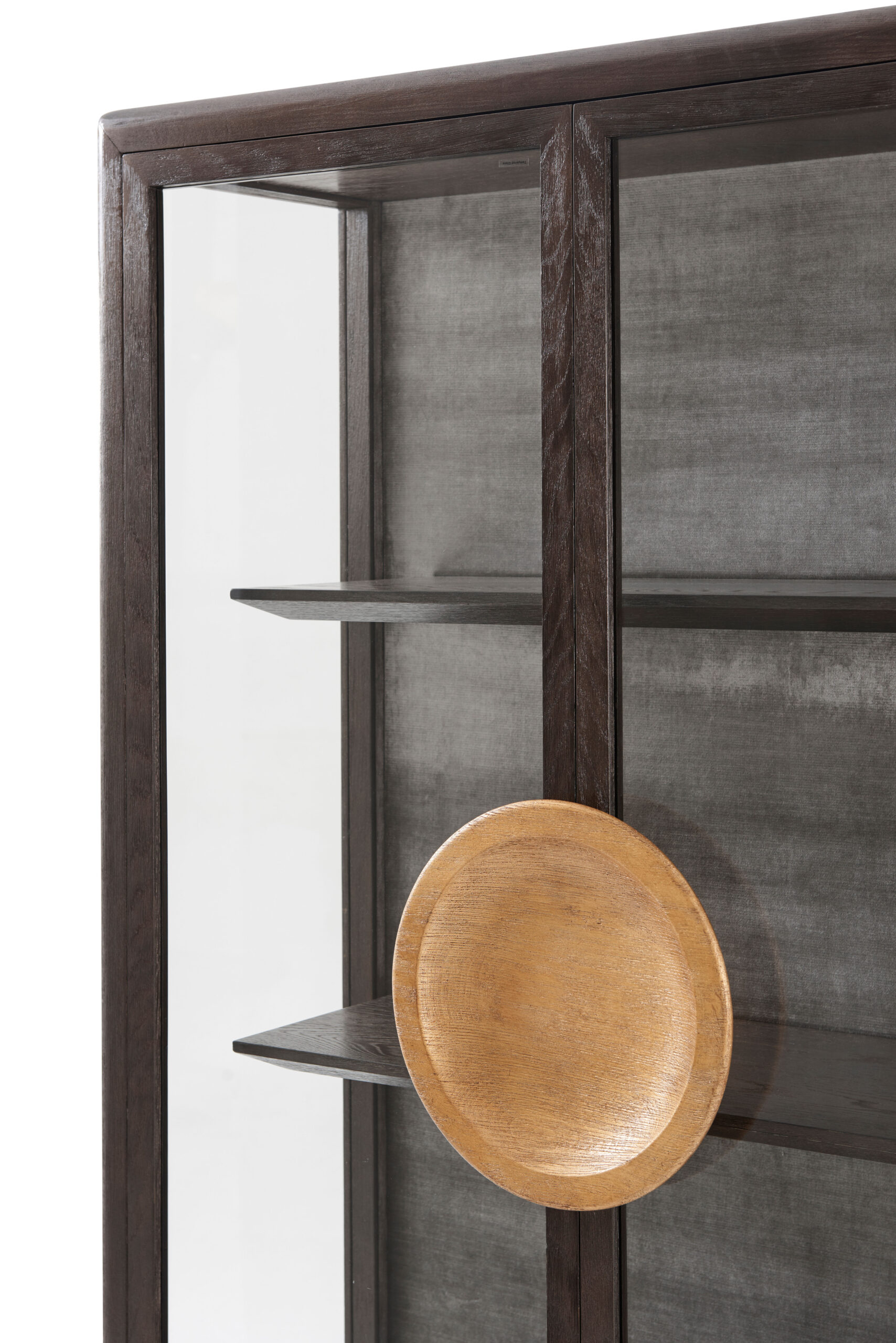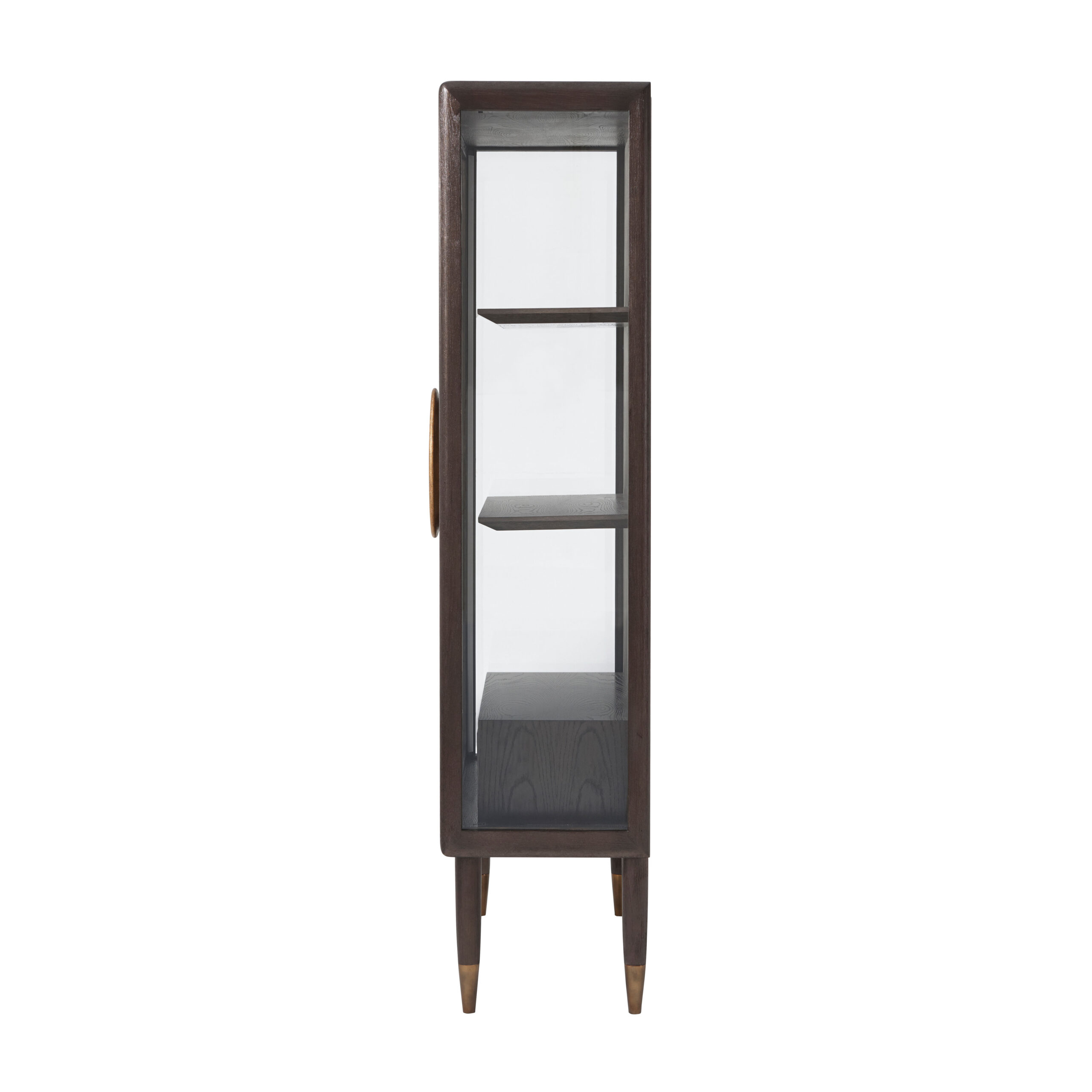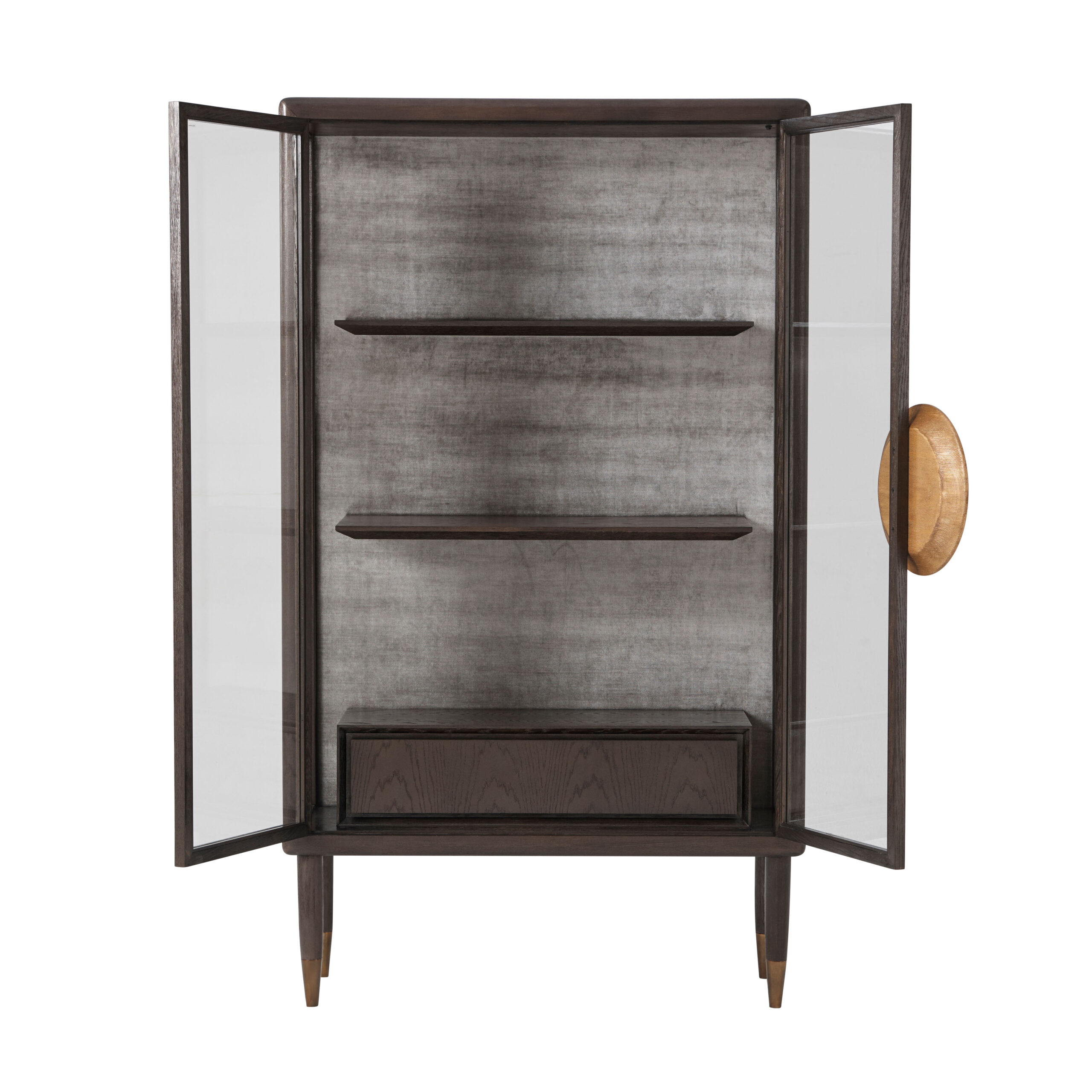 Βιτρίνα δίφυλλη με καπλαμά δρυός Crown, σε βουρτσισμένο λαμπερό χάλκινο φινίρισμα και χρυσές λαβές. Στο εσωτερικό, βελούδο στην πλάτη, δύο ράφια με φωτισμό LED και δύο συρτάρια. Πόδια σε σχήμα ακόντιου με ορειχάλκινα τελειώματα.