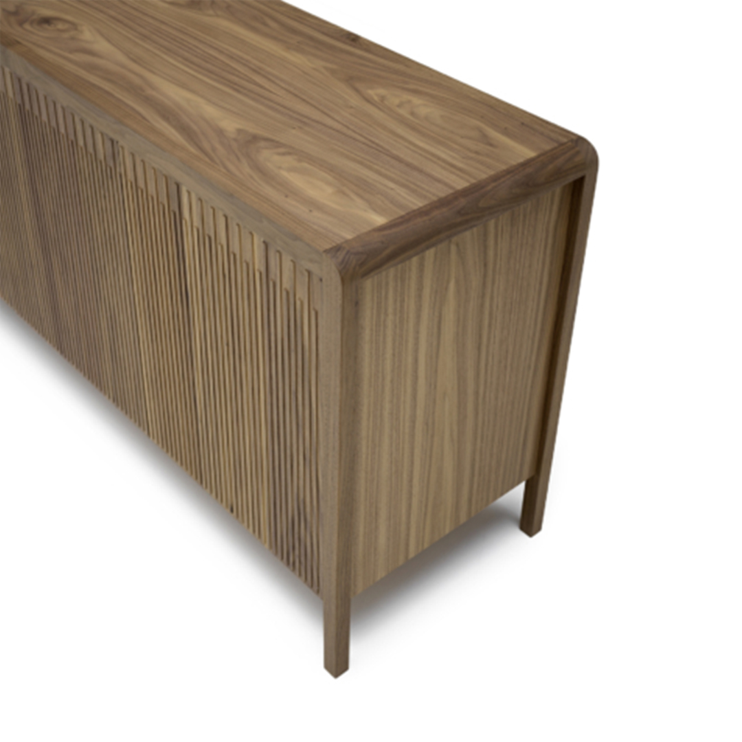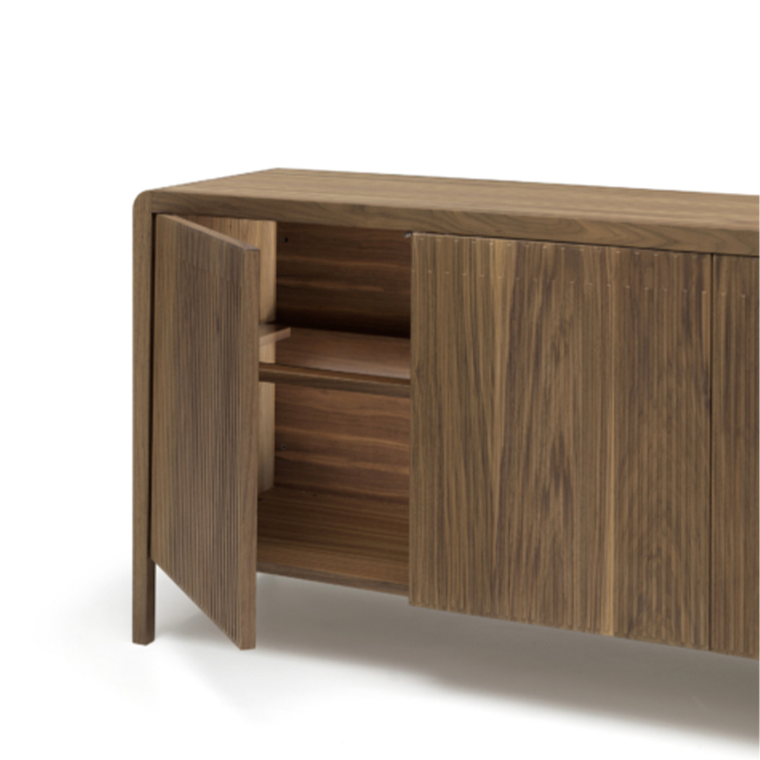 Leonardo sideboard combines the functionality and creativity in a modern design that enhances the quality of the best raw materials. Characterized by 4 doors and 2 internal glass shelves, the sideboard is extremely capacious and appeals for its attention to detail – in particular, the fronts are featured by the three-dimensional effect given by the solid wood workmanship, which creates a suggestive play of vertical lines, alternating solids and voids.
