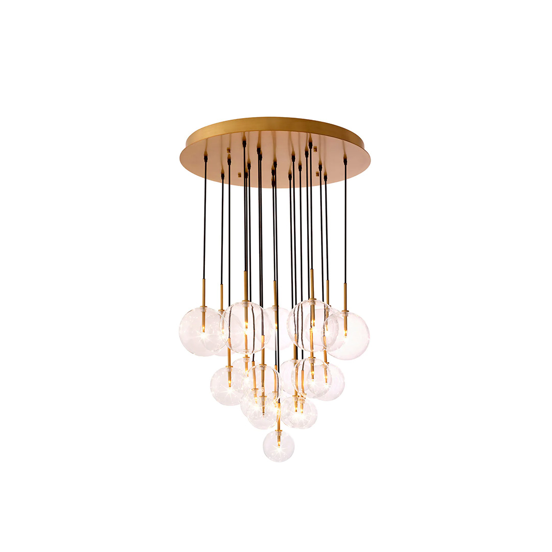 It features 12 clear glass spheres that are adjustable in height and thus can be hung in any desired pattern.