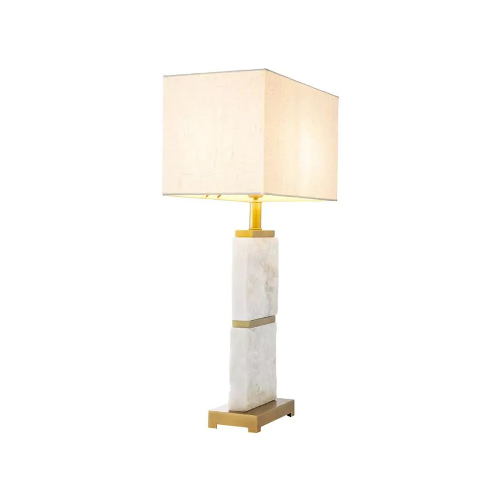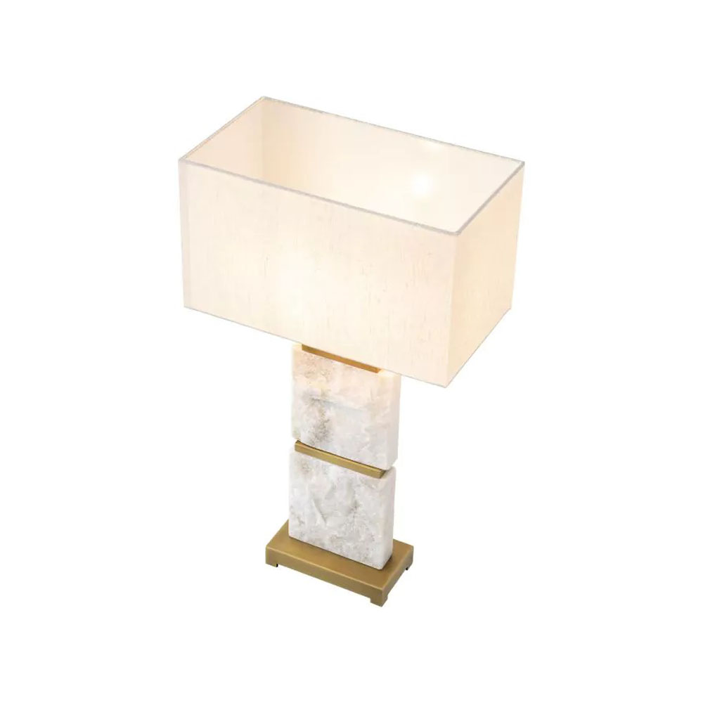 The large Newton Table Lamp pairs contemporary style with Mid-Century Modern appeal. Defined by a sculptural lamp base of rough white marble, this impressive antique brass table lamp will establish a chic and sophisticated aesthetic in your interior. It is supplied with a rectangular off-white lampshade.