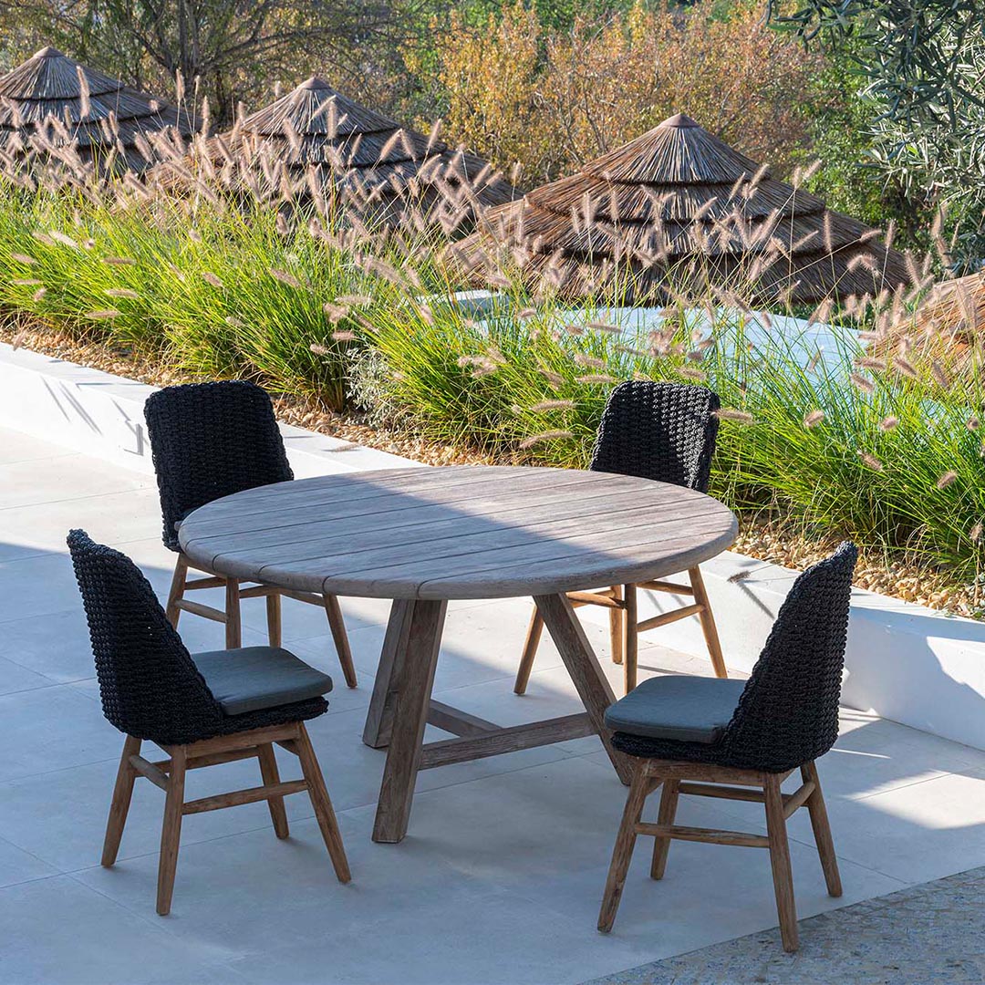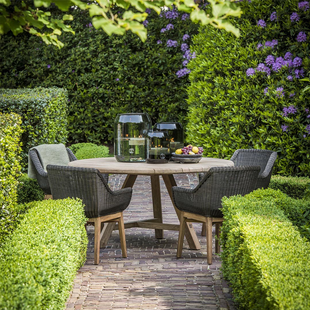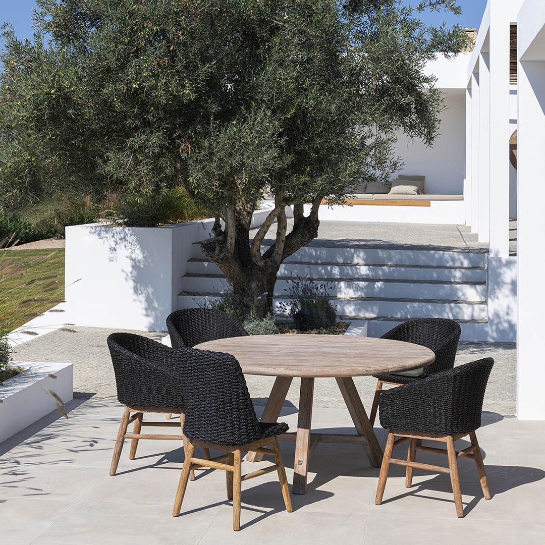 The Anton round dining table by Gommaire is a refined choice for outdoor spaces. Made from solid teak wood with a natural finish, it offers durability and timeless design. Its round shape encourages connection and conversation, making every meal a shared experience in style.