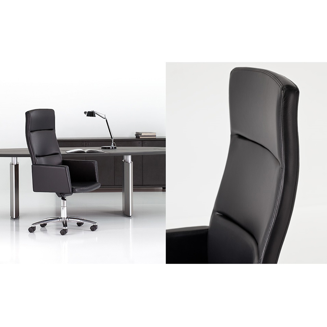 Armchair covered in soft leather. Base in polished aluminium or black lacquered.