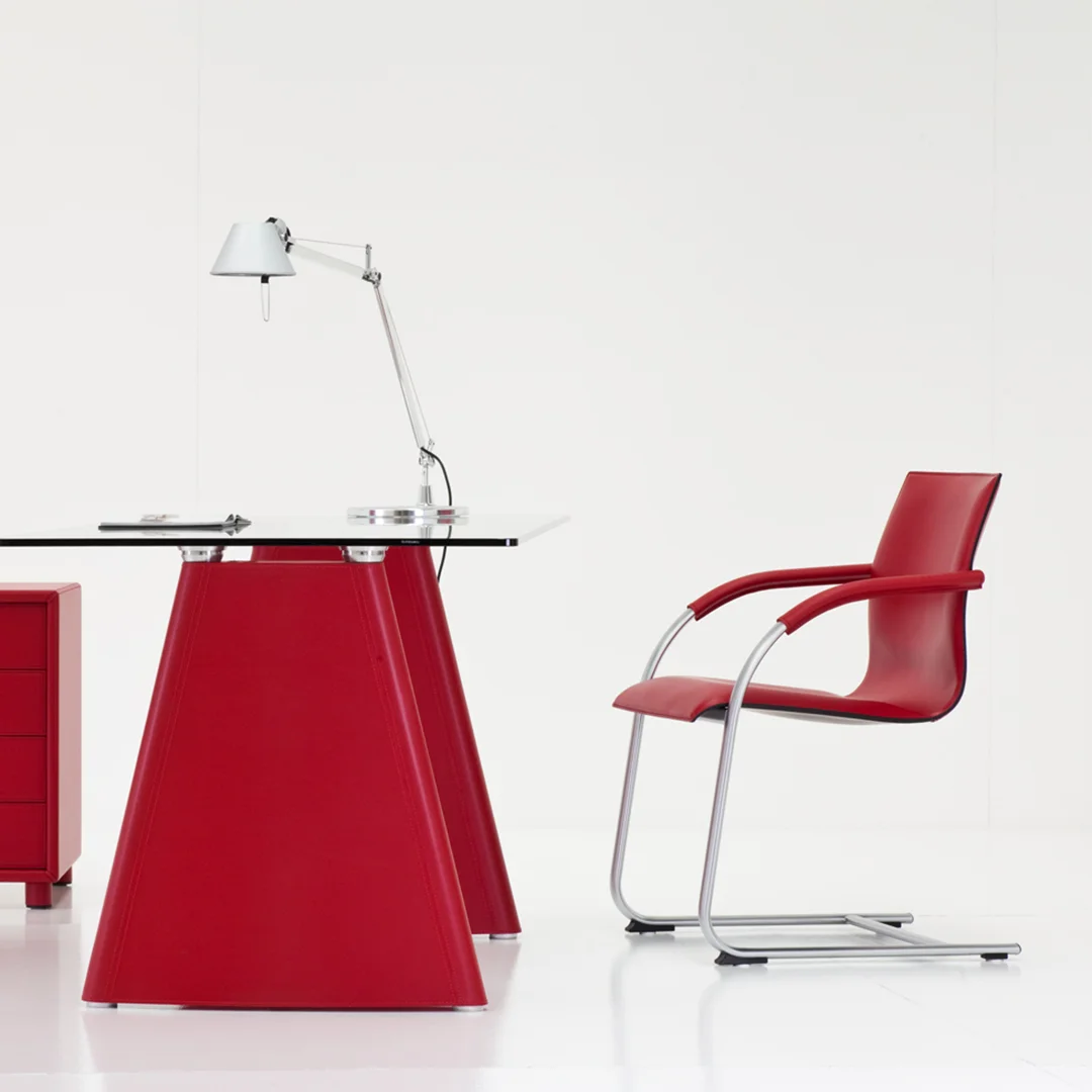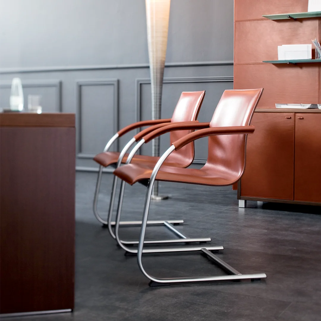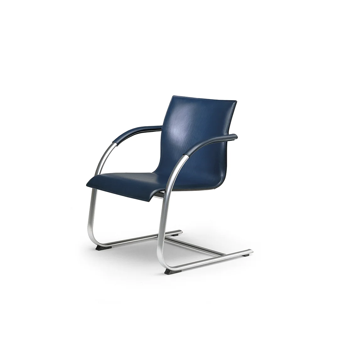 The Mitico Armchair features Satined Chrome frame and leather armrests, with high-density polyurethane foam padding for superior comfort. Finished in fine hard leather, it blends craftsmanship with durability.
