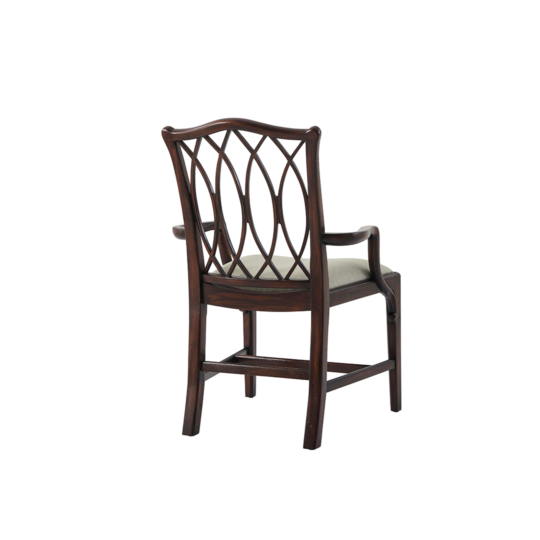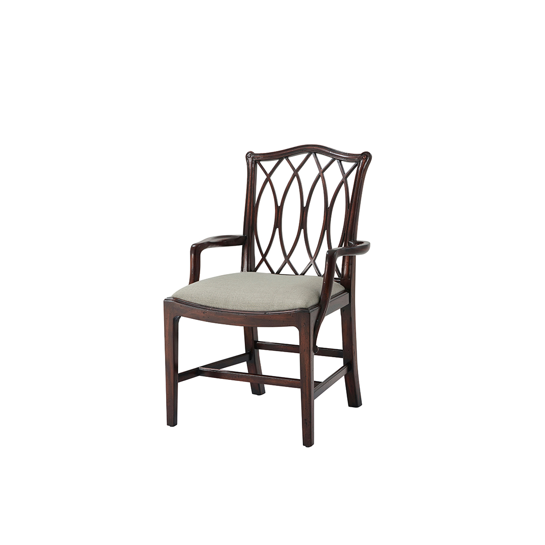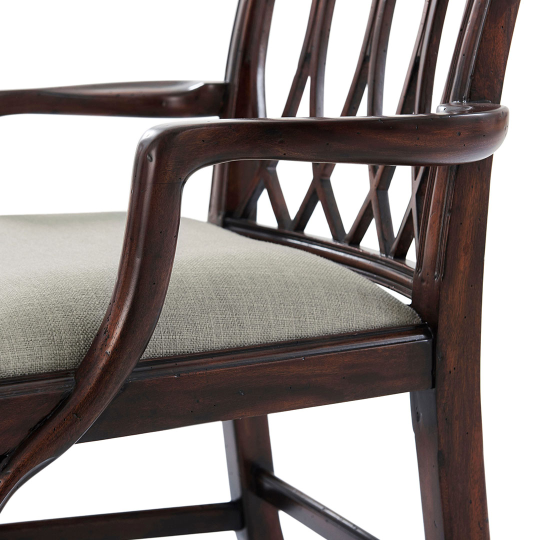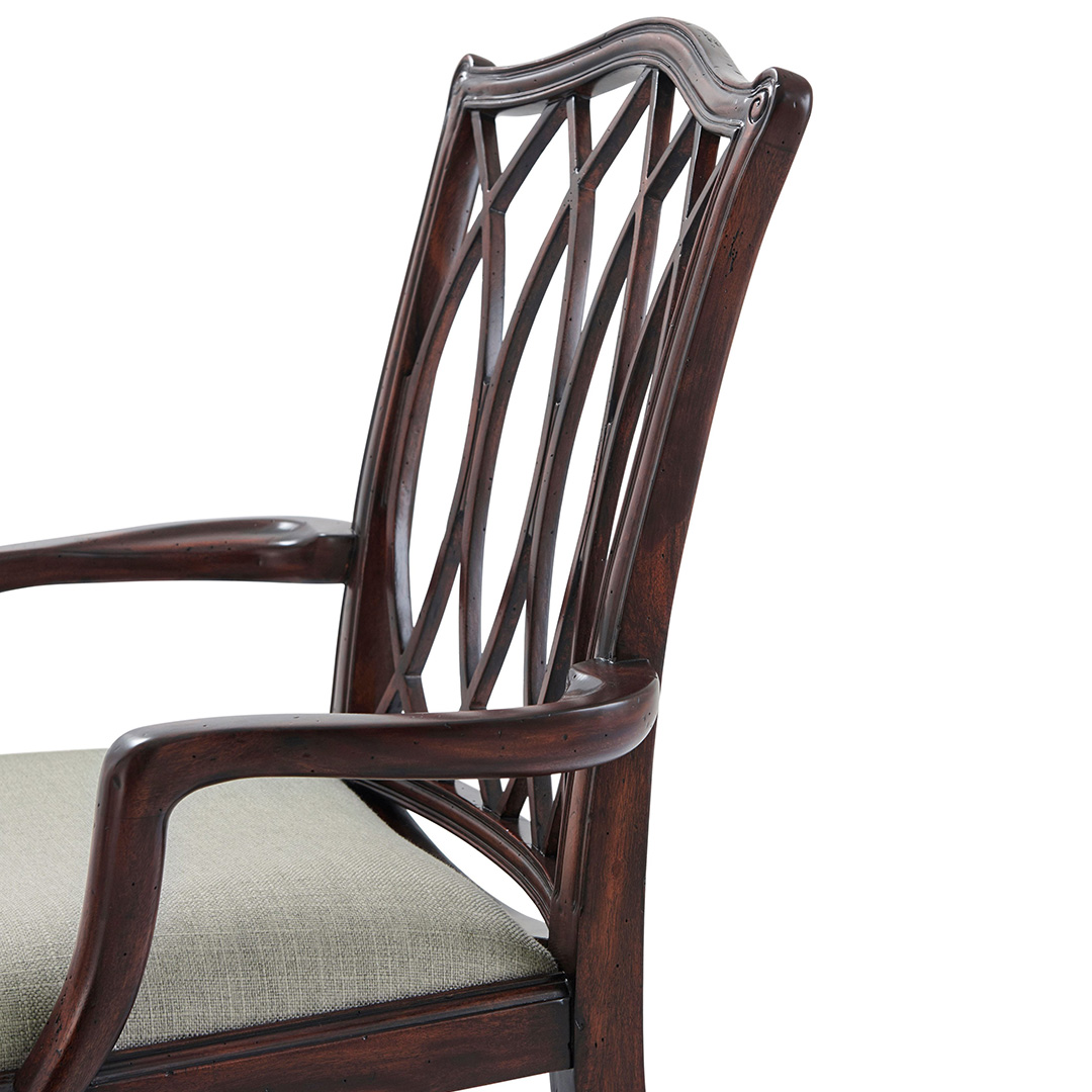 A serpentine armchair, with an interlacing trellis back, above a bowed upholstered seat, on chamfered legs. The original George III circa 1780.